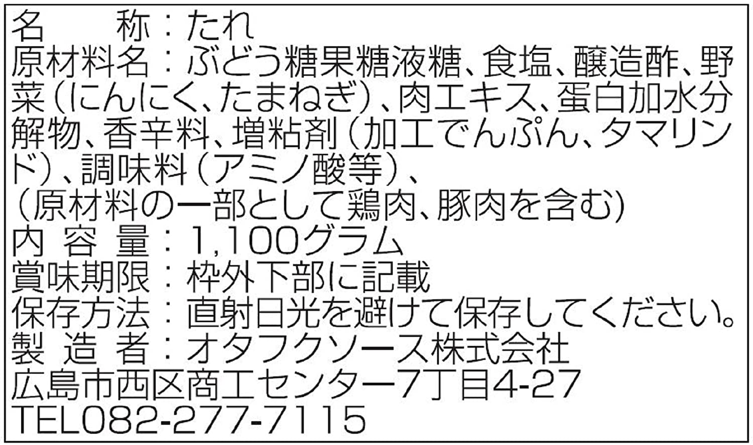 ・原材料:ぶどう糖果糖液糖、食塩、醸造酢、野菜(にんにく、たまねぎ)、肉エキス、蛋白加水分解物、香辛料、増粘剤(加工でんぷん、タマリンド)、調味料(アミノ酸等)、(原材料の一部として鶏肉、豚肉を含む)