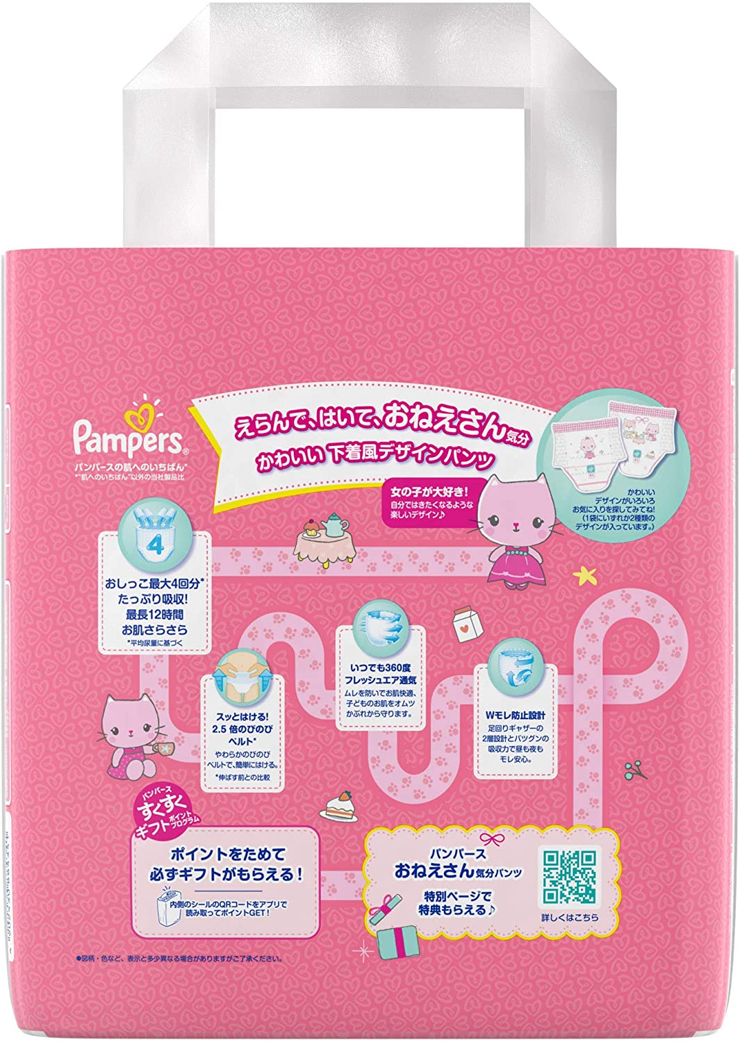 商品紹介パンパースの肌へのいちばん※ ※“肌へのいちばん"以外の当社製品比 おねえさん気分パンツ自分ではきたくなる かわいい 下着風デザインえらんで、はいて、おねえさん気分 女の子が大好き! 自分ではきたくなるような 楽しいデザインかわいいデザインがいろいろ お気に入りを探してみてね。(1袋にいずれか2種類のデザインが入っています。)おしっこ最大4回分※たっぷり吸収。最長12時間お肌さらさら※平均尿量に基づくスッとはける。2.5 倍のびのびベルト※ やわらかのびのびベルトで、簡単にはける。※伸ばす前との比較いつでも360度 フレッシュエア通気 ムレを防いでお肌快適、子どものお肌をオムツかぶれから守ります。Wモレ防止設計 足回りギャザーの2層設計とバツグンの吸収力で昼も夜もモレ安心。使用上の注意(1)汚れた紙おむつは早くとりかえてください。 (2)テープは直接お肌につけないでください。 (3)誤って口に入れたり、のどにつまらせることのないよう保管場所に注意し、使用後はすぐに処理してください。 お肌に合わないときは使用を中止し、医師に相談してください。持ち手を誤って首にひっかけたり、のどに詰まらせたりすることのないように、乳幼児の手の届かないところに保管してください。原材料・成分0ご注意(免責)>必ずお読みくださいご注意(免責)> 必ずお読み下さい 在庫完売の際は、お取寄せ又はキャンセルとなる場合がございます。また、配送予定日と弊社商品お届け予定日は異なる場合もございますので予めご了承下さい。 商品は予告なくパッケージ変更の場合もあります。※お客様都合によるご返品はお受けできません続きを見る