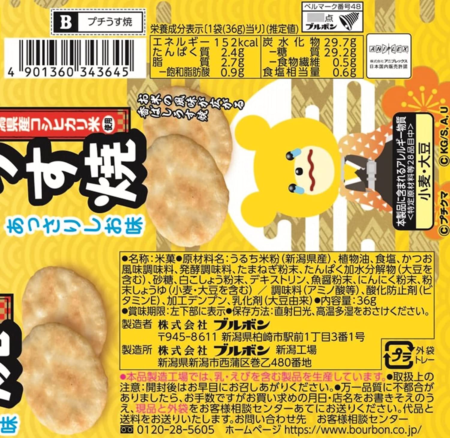 商品紹介新潟県産コシヒカリを100%使用し、新潟の水で仕込んだうす焼せんべいです。プチうす焼の発売当初から味付けに使用している「たまねぎ粉末」を米菓に練りこみ洋風の風味と旨味を引き立たせました。いつでもどこでも手軽に、みんなでシェアして食べてもお楽しみいただけます。「鬼滅の刃」とコラボした限定デザインです。原材料・成分うるち米粉(新潟県産)、植物油、食塩、かつお風味調味料、発酵調味料、たまねぎ粉末、たんぱく加水分解物(大豆を含む)、砂糖、白こしょう粉末、デキストリン、魚醤粉末、にんにく粉末、粉末しょうゆ(小麦・大豆を含む) / 調味料(アミノ酸等)、酸化防止剤(ビタミンE)、加工デンプン、乳化剤(大豆由来)