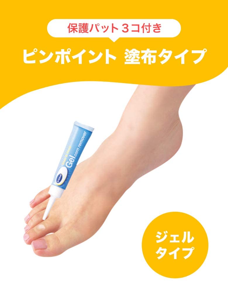 商品紹介ジェル コーンリムーバーは、サリチル酸の角質軟化作用を利用した医薬品です。ジェルタイプなので液だれしにくく、簡単に患部に塗布できます。患部に塗布ししばらくすると乾燥し白い被膜をつくり、厚く硬くなった皮ふをやわらかくして、うおの目・たこ・いぼを取り去ります。医薬品の販売について●使用上の注意■■してはいけないこと■■守らないと現在の症状が悪化したり、副作用が起こりやすくなります1.次の人は使用しないでください サリチル酸およびアスピリン等のサリチル酸系薬剤に対し過敏症の既往歴のある 人。2.次の部位には使用しないでください (1)顔面、目の周囲や唇、首のまわりなど皮膚のやわらかい部分、粘膜など。 (2)炎症又は傷のある患部。 (3)みずいぼ。 (4)肛門周囲や外陰部にできたいぼ。 (5)一列に並んだいぼ、群生したいぼ、身体に多発したいぼ。■■相談すること■■1.次の人は使用前に医師、薬剤師又は登録販売者に相談してください (1)医師の治療を受けている人。 (2)乳幼児。 (3)薬などによりアレルギー症状を起こしたことがある人。 (4)妊婦又は妊娠していると思われる人。 (5)次の症状のある人:血行障害、糖尿病。 (6)授乳中の人。2.使用後、次の症状があらわれた場合は副作用の可能性があるので、直ちに使用を 中止し、この説明文書を持って医師、薬剤師又は登録販売者に相談してください (1)本剤の使用により、次の症状があらわれた場合。 〔関係部位〕 皮膚 〔症状〕 発疹・発赤、かゆみ、はれ、刺激感 (2)本剤を1週間位使用しても症状の改善がみられない場合。3.本剤をいぼにご使用の場合、本剤が有効なのは角質化された表面のざらざらした 固いいぼです。ほかのいぼについては専門医に相談してください。4.塗布した患部の周囲にしみ状の跡形がつく時がありますが、これは一時的で、塗 布を中止すればもとの皮膚にもどります。長引く場合は、医師、薬剤師又は登録 販売者に相談してください。[その他の注意]本剤が健康な皮膚に付着すると、その部分も白く軟化し痛んだりするので、もし付着した場合にはすぐにふきとってください。特に、指の間に塗布する場合は薬液が乾くのを確認してください。●効能・効果うおのめ、たこ、いぼ●用法・用量1日、数回患部に適量を塗布してください。(1)定められた用法・用量を守ってください。(2)目に入らないように注意してください。万一目に入った場合には、すぐに水又 はぬるま湯で洗い、直ちに眼科医の診療を受けてください。(3)小児に使用させる場合には、保護者の指導監督のもとに使用させてください。(4)本剤は外用のみに使用し、内服はしないでください。(5)うおの目・たこ・いぼが多数ある場合は、一度に全部の患部に使用せず、一ヵ 所又は二ヵ所ずつ使用してください。一度に多量の薬液を使用しますと皮ふを 荒らします。(6)患部の周りの皮ふにつかないよう、よく注意して使用してください。●成分・分量1g中 サリチル酸・・・0.15g添加物として、ヒドロキシプロピルセルロース、ピロキシリン、乳酸、ヒマシ油、dl-カンフル、アセトン、エーテル、エタノール、だいだい色403号、黄色406号を含有します。●保管及び取扱いの注意(1)本剤は揮発性ですので、ご使用後はオーバーキャップをカチッとするまで しっかり締めて、直射日光の当たらない湿気の少ない涼しい所に保管して ください。 (キャップの締めがゆるいと薬剤が固まり、使用できなくなります。)(2)小児の手にとどかない所に保管してください。(3)本剤は引火性ですので、火気に近づけないでください。(4)衣類についた場合は、ぬるま湯でゆっくりともみほぐして落としてください。(5)誤用をさけ、品質を保持するため、他の容器に入れ替えないでください。(6)ニス塗りの家具類には、本剤がつかないように注意してください。(7)使用期限をすぎた製品は使用しないでください。[その他の記載内容]〔ご使用の前に〕ジェル コーンリムーバーのご使用に際し、以下の要領にて製品を 開封して下さい。(1)黄色のスペーサーリングを指ではさみ、左に回してチューブ本体と スペーサーリングを分離します。(2)スペーサーリングを左に回して取り外し、オーバーキャップとノズルキャップを 合体させたまま、チューブ本体を立てた状態でノズルキャップをチューブ本体を 押さえないようにしながら、チューブにねじ入れます。 (スペーサーリングは捨てていただいて結構です)(3)チューブ本体とノズルキャップがしっかりはまっているのを確認した後、 オーバーキャップをはずしてご使用ください。 キャップの取り付け時にチューブ本体を押すと中身がこぼれでる可能性が あります。〔ジェル コーンリムーバーの上手な使い方の例~うおの目の場合~〕(1)患部にジェル コーンリムーバーを適量塗布します。入浴後、患部をよく拭いて からご使用になると一層効果的です。 (塗布した後に入浴、水仕事をしてもさしつかえありません。)(2)薬液はしば