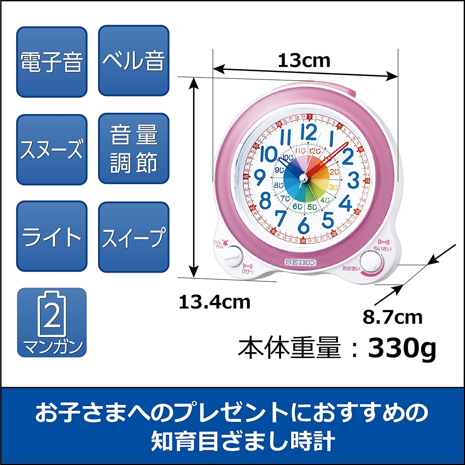 カラー:02:ピンク?|?スタイル:単品?|?パターン(種類):01:通常商品紹介初めて使うものだからこそ、しっかりした時計を贈りたい。お子さまへのプレゼントにおすすめの知育目ざまし時計。◆楽しく学べる知育時計教えやすくわかりやすい工夫が満載!①時針・分針がそれぞれ時計と同じ色をしているので時刻が読みやすい。②目盛に0~59の数字がついているので覚えやすい。③時間別に色分けしたサークルで時間が分かりやすい。より●セイコーが提案する新しい知育の形。お子様が初めて使うものだからこそ、しっかりした時計を贈りたい。お子様へのプレゼントにおすすめの知育目覚まし時計。大好評の掛け時計に続いて「目覚まし時計」登場!