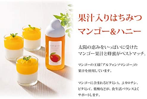 南国の果物の王様マンゴーの果汁と蜂蜜がベストマッチ。 蜂蜜と果汁の組み合わせで、バランスの良い健やかな毎日を。 果汁蜜シリーズには、栄養たっぷりの蜂蜜とビタミンがバランス良く含まれています。 マンゴー&ハニーは、フルーツ王国のインド産マンゴーの中でも、王様といわれている、「アルフォンソマンゴー」の果汁を使用しています。 マンゴーにはビタミンA,βカロチン、ビタミンC、葉酸が含まれており、緑黄色野菜の栄養成分を手軽に摂取したい方にお勧めです。 毎日のバランスよい食生活をサポートする食品です。 ジャム、ジュース、マンゴープリンの材料としてもお使い頂けます。 ※果汁由来の成分が浮遊・沈殿することがあります。また、はちみつと果汁が分離することがありますが、品質上問題はありません。良く振ってご利用ください。