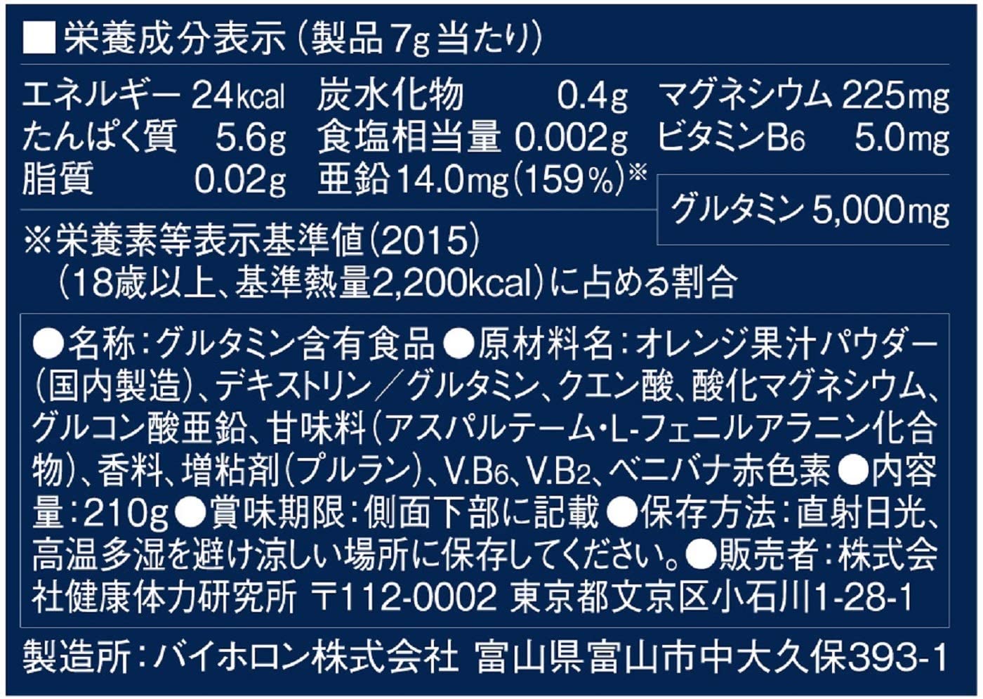 ・原材料 :オレンジ果汁パウダー、デキストリン、L-グルタミン、クエン酸、酸化マグネシウム、香料、グルコン酸亜鉛、甘味料(アスパルテーム・L-フェニルアラニン化合物)、ベニバナ赤色素、増粘剤(プルラン)、ビタミンB6、ビタミンB2