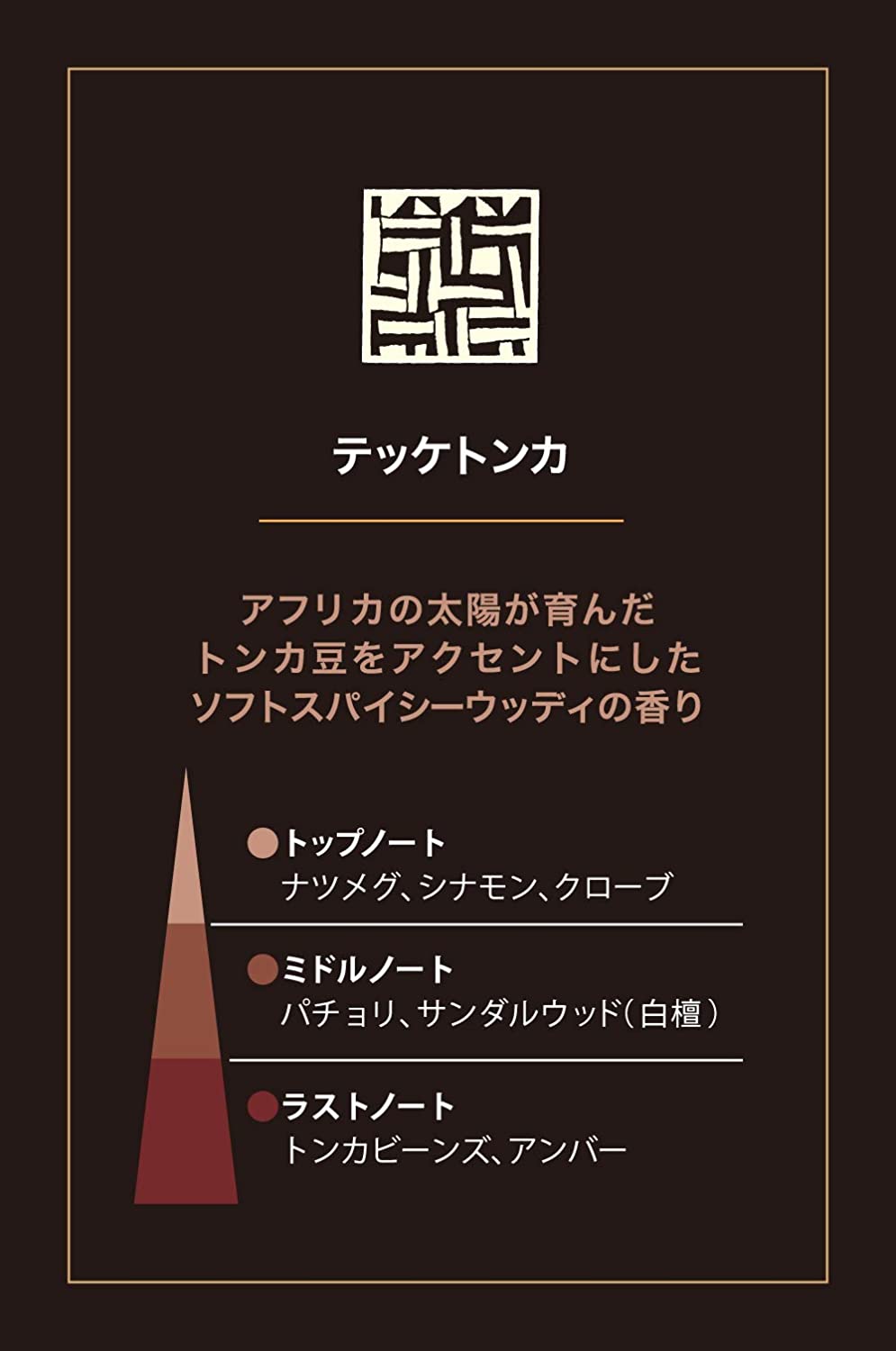 商品紹介洗練された芳香で、お部屋に落ち着きある雰囲気を演出します。燃焼中だけでなく、火が消えた後の残り香もお楽しみいただけます。香立てつき。マダカスカルシナモンやザンジバルクローブなどのスパイスを贅沢に使用し、アフリカの太陽が育んだトンカ豆をアクセントにした芳しい香り。使用上の注意お香の先端に火をつけ、炎を消した後、付属の香立てを使用し、灰が落ちないように下に不燃性のお皿を敷いて焚いてください。