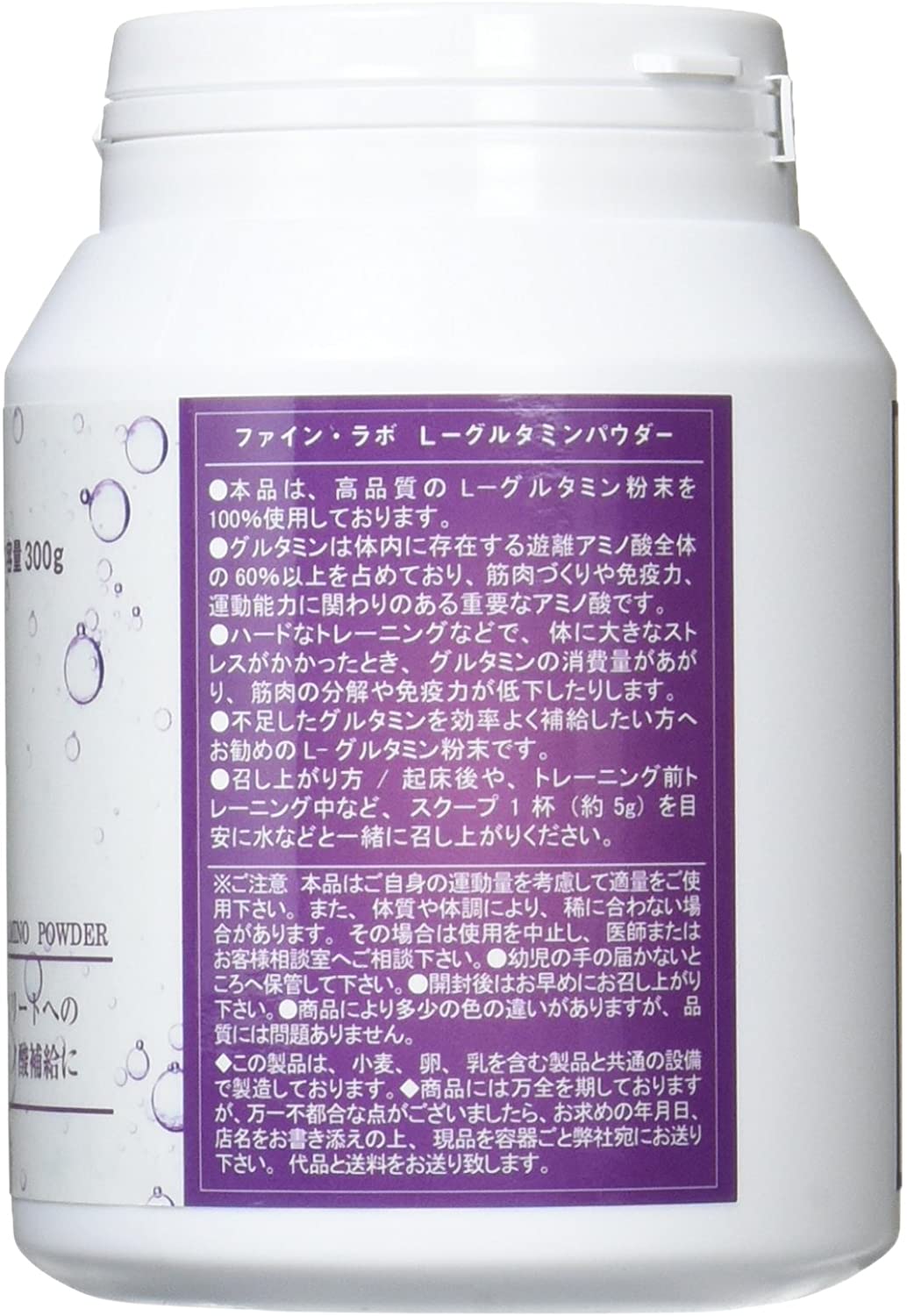 ・本品、ファイン・ラボ グルタミンパウダーは 純度の高い最高級品質のL-グルタミンを100%使用しております。 ・原産国 : 日本 ・原材料 : L-グルタミン ・栄養成分 : (製品5gあたり)エネルギー 20kcal たんぱく質 5g 脂質 0g 炭水化物 0g ナトリウム 0mg L-グルタミン 5g ・ 【商品詳細】 [商品スペック]●内容量 : 300g●品名・名称 : アミノ酸含有食品●原材料 : L-グルタミン●成分 : 【配合成分およびその含有量】L-グルタミン 5g●栄養成分 : 栄養成分表示(製品5g中)エネルギー:20.1Kcal、たんぱく質:4.965g、脂質:0.025g、炭水化物:0.005g、食塩相当量:0.0g、L-グルタミン 5g●召し上がり方 : 付属スプーン1杯(約5g)を目安に水などと一緒にお召し上がりください。●保存方法 : 高温・多湿、直射日光を避けて涼しい場所で保管してください。●注意事項 : ・本品はご自身の運動量を考慮して適量をご使用ください。また、体質や体調により、稀に合わない場合があります。その場合は使用を中止し、医師またはお客様相談室へご相談ください。・幼児の手の届かないところへ保管してください。・開封後はお早めにお召し上がりください。・商品によて多少の色の違いがありますが、品質には問題ありません。[商品詳細]アスリートへのアミノ酸補給に●本品は、高品質のL-グルタミン粉末を100%使用しています。●グルタミンは体内に存在する遊離アミノ酸全体の60%以上を占めており、筋肉づくりや免疫力、運動能力に関わりのある重要なアミノ酸です。…