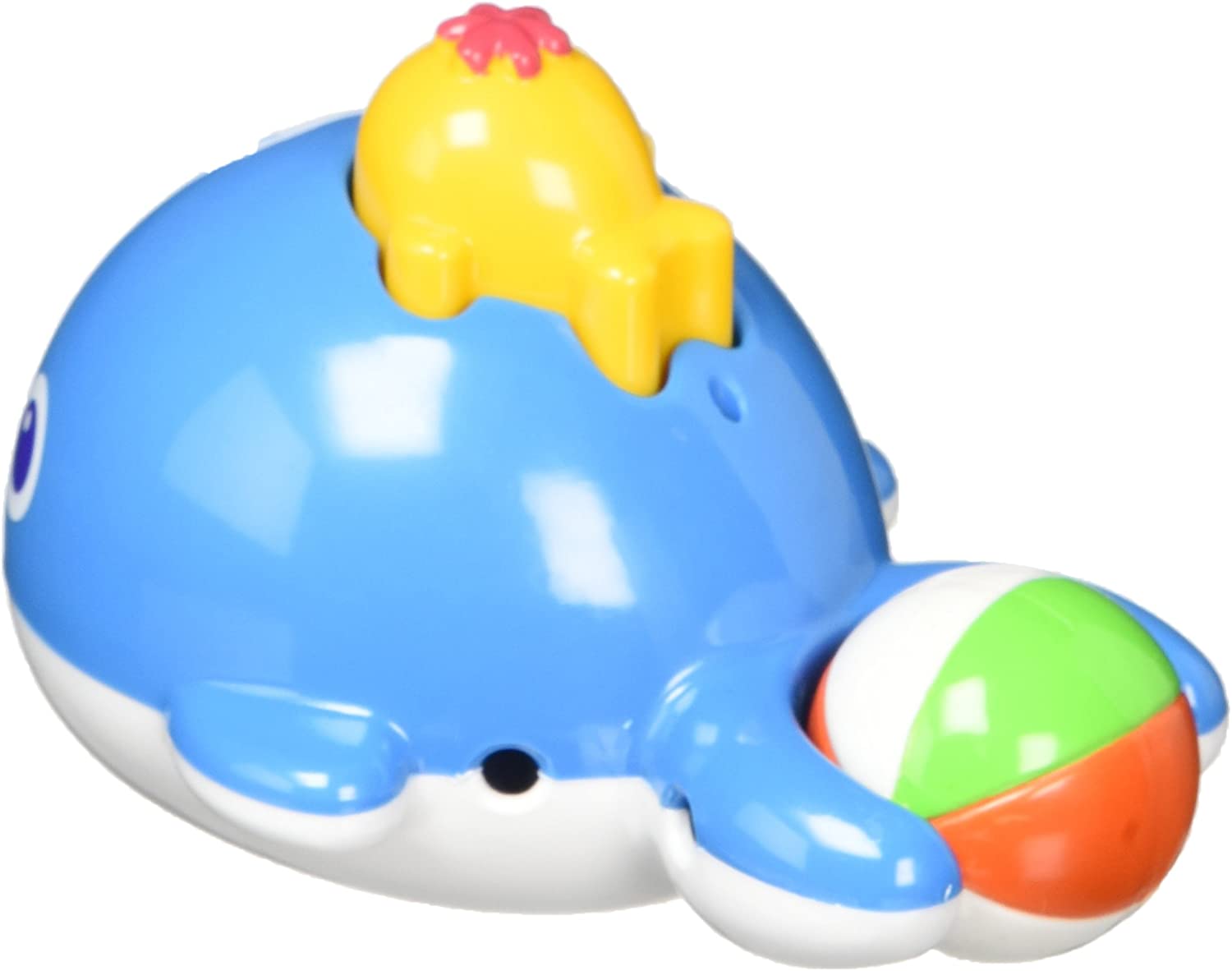 商品紹介クジラ型おふろトイ。本体を沈めてから子クジラを押すと親クジラの頭から水が飛び出する。親クジラの尻尾の部分のボールはクルクル回る。安全警告STマーク
