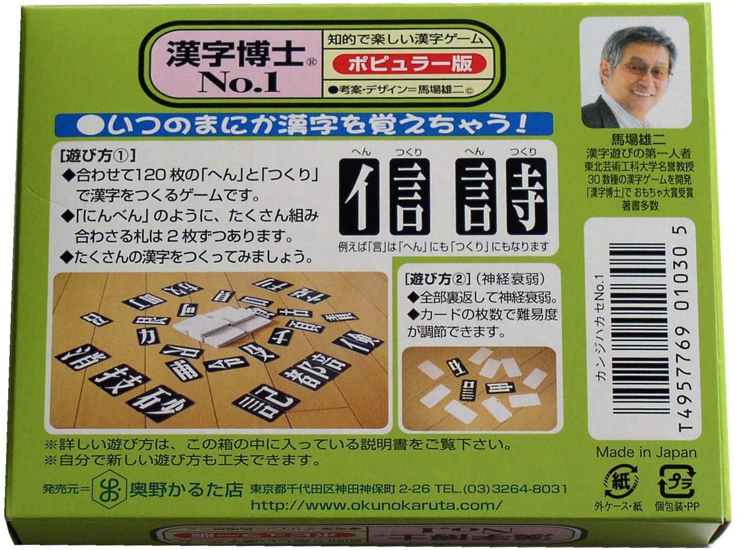 へんとつくりのカードを合わせてたくさんの漢字を作った人の勝ち。120種類のカードの内、へんにもつくりにもなるカード43種類をうまく使えばゲーム性がより深まる。何人でも遊べ、年齢も問わず楽しめる。子どもの学習に、大人の脳トレに、外国人への日本文化の紹介にも最適。漢字組み合わせ一覧表を掲載した解説書付き。カード126枚、解説書