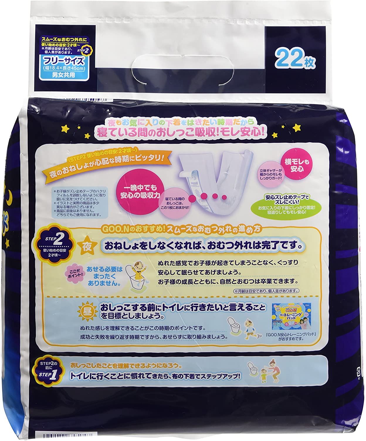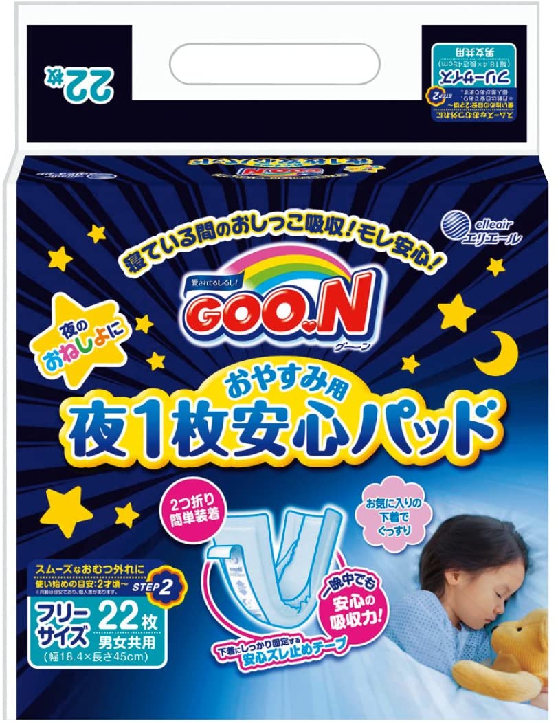 商品紹介商品紹介「グーン おやすみ用 夜一枚安心パッド 22枚入」は、夜長時間でも安心のおしっこ約3回分を超吸収できる夜用おむつです。(*1回分の吸収量を70ccとした時)全面通気性でムレ・カブレも安心。2つ折形状なのでかんたんに装着できて便利です。フリーサイズなのでどのお子様にもぴったりフィット。幅広い年齢のお子様にご利用いただけます。ズレ止めテープ付きで動いてもズレにくい。お問い合わせ先エリエールお客様相談室/0120-205-205受付時間/土、日、祝日を除く9:30-16:30使用上の注意使用上の注意●正しく装着しても、ズレたり隙間があいたりする場合は、ゴムがしっかりしてズレにくい布製トレーニングパンツ等との併用をおすすめします。●お子様がパッドを口に入れたりしないよう、お子様の手の届かない所に保管してください。また、ハクリ紙を誤飲しないように取り扱いに気をつけてください。●パッドの内部の高分子吸水材は、水分を吸収するとゼリー状になりますが、お子様の肌に触れても安心です。●暖房器具の近く等、高温になる場所に置かないでください。●パッドですので、洗濯しないでください。あやまって洗濯した場合、パッドの中身が他の衣類につくことがありますが、その場合は水で充分に洗い流してください。●汚れたパッドは早くとりかえてください。●テープは直接お肌につけないでください。●誤って口に入れたり、のどにつまらせることのないよう保管場所に注意し、使用後はすぐに処理してください。使用後の処理方法●パッドに付着した大便は、トイレに始末してください。●汚れた部分を内側にして丸めて、不衛生にならないように処理してください。●トイレにパッドを捨てないでください。●使用後のパッドの廃棄方法は、お住まいの地域のルールに従ってください。●外出時に使ったパッドはお持ち帰りましょう。原材料・成分材質●表面材/ポリオレフィン系不織布●吸水材/綿状パルプ、吸収紙、高分子吸水材、ポリオレフィン系不織布●防水材/ポリエチレン系フィルム●止着材/スチレン系合成樹脂 等 ●伸縮材/ポリウレタン●結合材/スチレン系合成樹脂 等使用方法使用方法1.パッドをパンツに挿入するお子様を立たせた状態でパンツを膝まではかせてください。パッドを2つ折りの状態のまま、ハクリ紙をはがし、パンツに挿入します。このとき他の部分につかないように注意してください。2.パッドをパンツに固定するパッドの2つ折りの部分の角をパンツの股間部に合わせてください。次にパッドを広げて折りじわをのばしながら、前後をパンツに固定してください。3.パンツを引き上げるパッドがパンツの中央に固定されている事を確認し、パンツを引き上げてください。*おしっこ約2回分(1回70cc)の吸収量がありますが、ぬれたら必ず交換して下さい。ご注意(免責)>必ずお読みください体質によってかぶれが出る場合や、おむつが合わないなどの場合は使用を中止してください。続きを見る