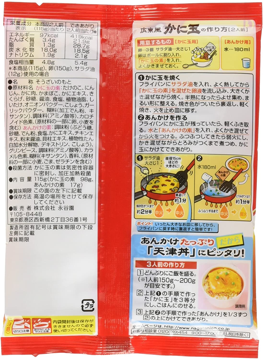 ・原材料:かに玉の素:たけのこ、にんじん、かに肉、かまぼこ、かにエキス、きくらげ、砂糖、醤油、食塩、植物油脂、しいたけ、オニオンパウダー、こしょう、ガーリックパウダー、糊料(加工でん粉、キサンタン)、調味料(アミノ酸等)、カロチノイド色素、(原材料の一部に卵、小麦を含む) あんかけの素:調味粉(ぶどう糖、砂糖、でん粉、食塩、かにエキス、チキンエキス、粉末醤油、貝柱エキス、植物性たん白加水分解物、デキストリン、こしょう)、グリンピース、調味料(アミノ酸等)、カラメル色素、糊料(キサンタン)、香料、(原材料の一部に小麦、ごま、ゼラチンを含む)
