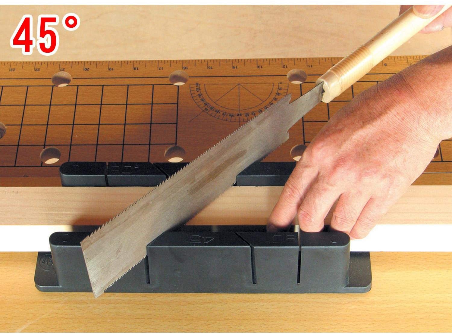 サイズ:M45°、90°の溝が切ってあるので鋸の切断が正確にできる作業台等にしっかり固定できるねじ穴付プラスチック製なので刃物を傷めない