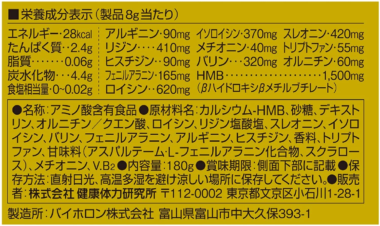・原材料 : カルシウム-HMB、ショ糖、マルトデキストリン、L-オルニチン、クエン酸、L-ロイシン、L-リジン、L-スレオニン、L-イソロイシン、香料、L-バリン、L-フェニルアラニン、L-アルギニン、L-ヒスチジン、L-トリプトファン、甘味料(アスパルテーム、L-フェニルアラニン化合物、スクラロース)、L-メチオニン、V.B2