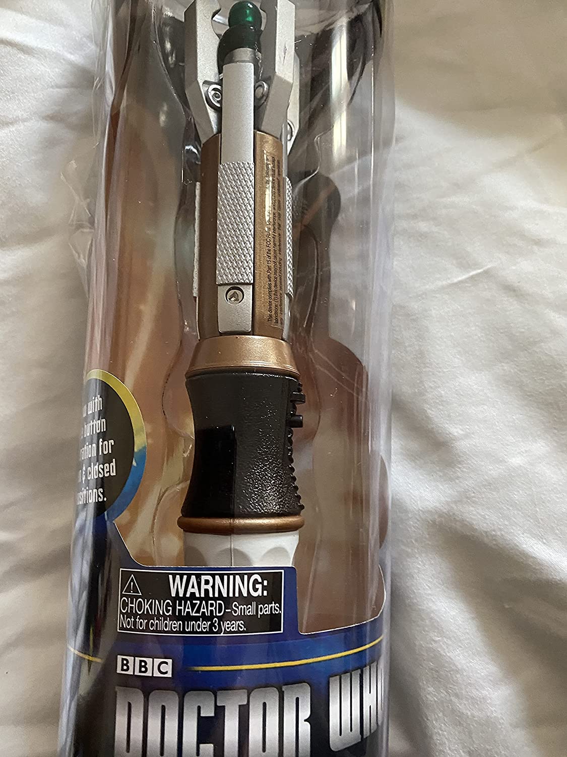Stay well equipped on your adventures through time with the Sonic Screwdriver owned by the Eleventh Doctor Who , played by Matt Smith. This latest one is larger, with a luminous green light , but continues to be an essential part of the Doctor's equipment as he explores the universe. This faithful copy of the Doctor's trusty sonic device has spring loaded extending action , simply press a button on the side, to extend the head and open the claws. Pressing the other button activates the flashing LED light and four different sound effects . Flip open the cap at the end of the Screwdriver to reveal an additional light and sound effects button. The Eleventh Doctor's Sonic Screwdriver is a perfect toy for any Doctor Who fan.