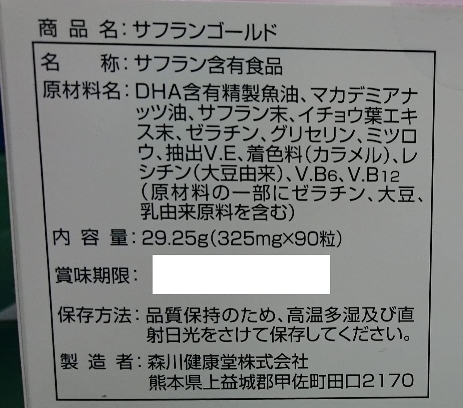 ・原材料 : DHA含有精製魚油、マカデミアナッツ油、サフラン末、イチョウ葉エキス末、ゼラチン、グリセリン、ミツロウ、抽出VE、着色料(カラメル)、レシチン(大豆由来)、V.B6、V.B12、(原材料の一部にゼラチン、大豆、乳由来成分を含む)