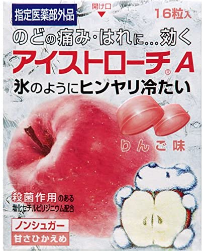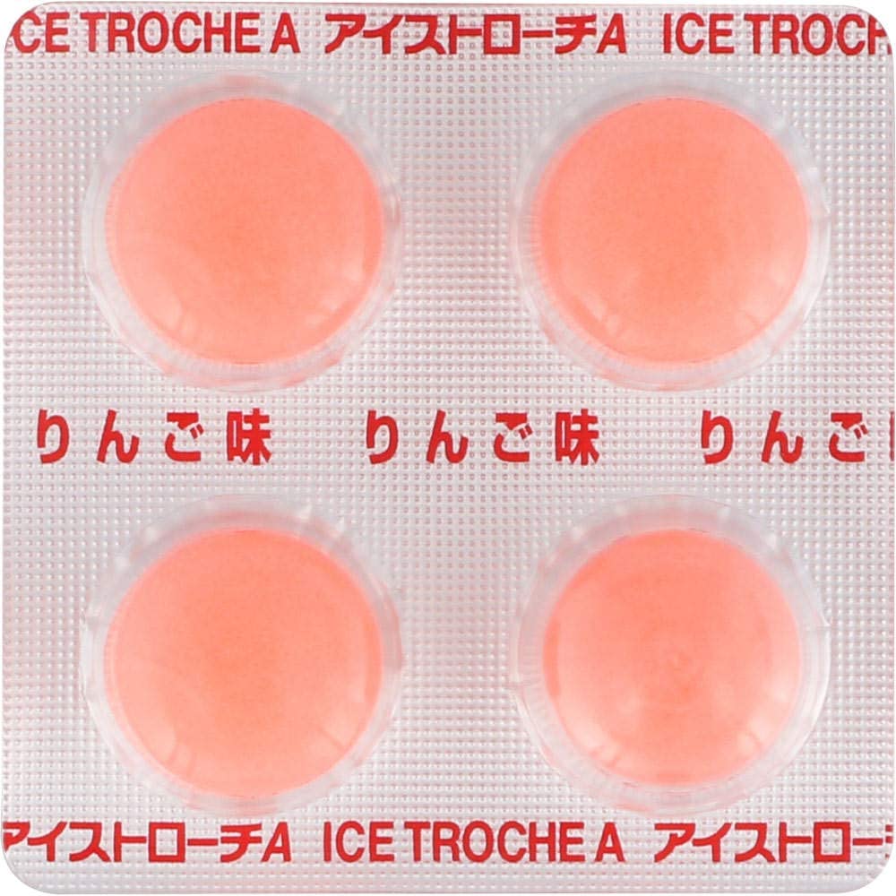 ・原産国 : 日本 ・原材料 : 塩化セチルピリジニウム(殺菌成分) 1mg、添加物:?-メントール、D-ソルビトール、グリセリン脂肪酸エステル、ビタミンC、クエン酸、香料、赤色106号、黄色5号 ・内容量 : 16錠 ・カロリー : 96kcal ・商品サイズ (幅X奥行X高さ) : 73mm×29mm×93mm 【商品詳細】 フレーバー:りんご味商品紹介殺菌作用のある塩化セチルピリジニウムを配合したトローチ剤です。氷のようにヒンヤリとして冷たい服用感です。ほどよい時間で口中から溶けてなくなるトローチサイズです。携帯しやすいプラスチックシート包装です。ご注意(免責)>必ずお読みくださいメール便・定形外郵便で発送致します。 お届けはポスト・新聞受け等への投函となります。発送後の商品の紛失・破損などのトラブルにつきましては一切の責任を負いかねます。発送後のご注文キャンセルにつきましては、理由の如何を問わずお断り致します。予めご理解・ご了承の上、ご注文をお願い致します。