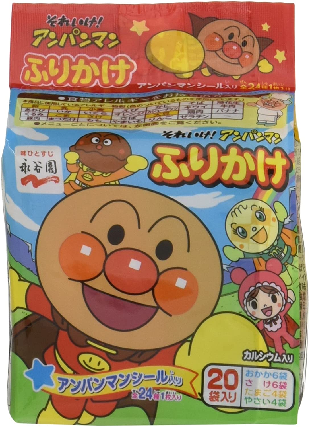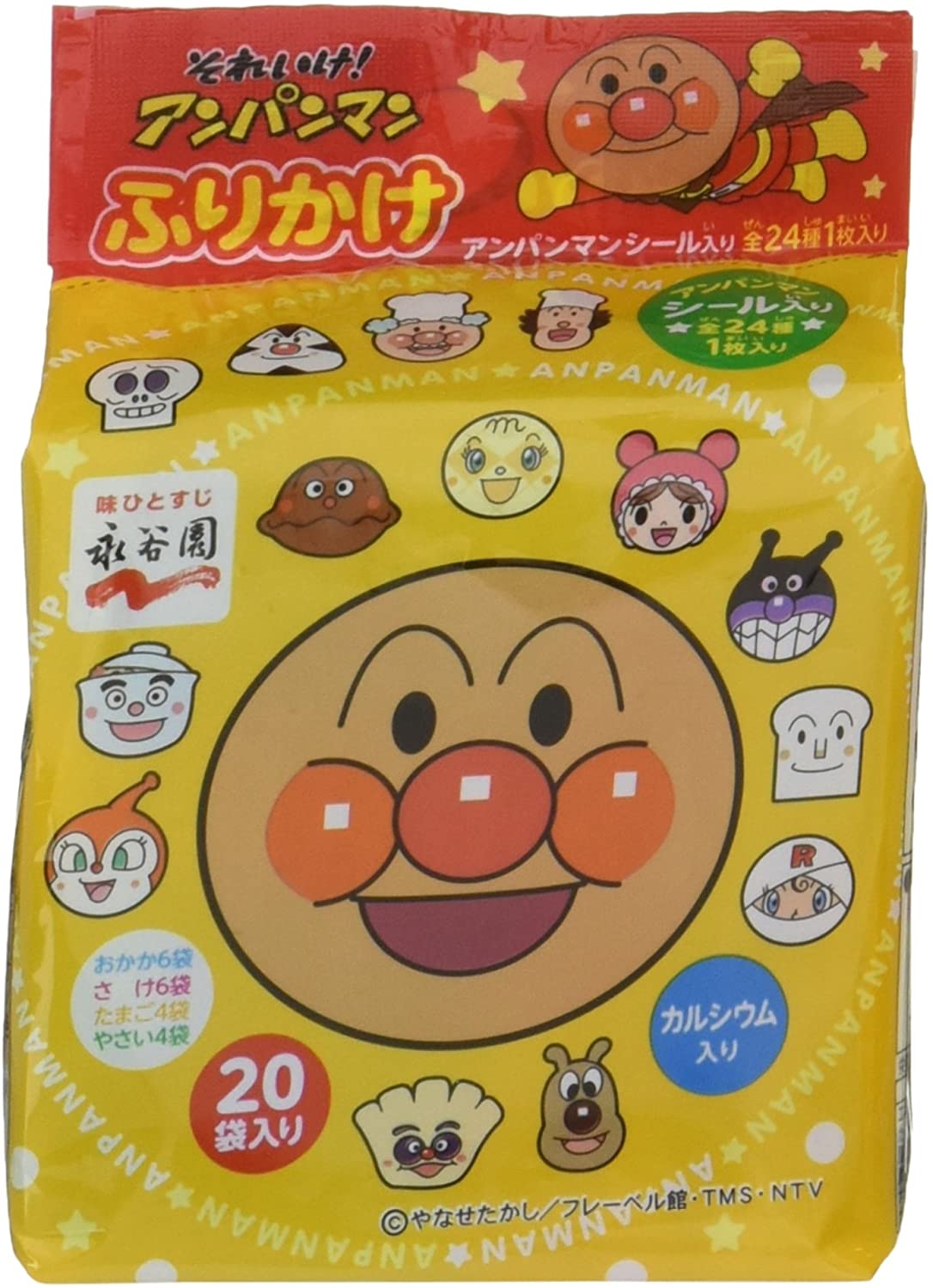 商品紹介お子さまに大人気の「それいけ! アンパンマン」を起用したふりかけです。〈br〉おかか・さけ・たまご・やさいの4種類を詰め合わせたアソートタイプで、育ち盛りのお子さまにうれしいカルシウム入りです。〈br〉かわいい「アンパンマンシール」(全24種)が1枚おまけとして入っています。原材料・成分おかか:調味顆粒(麦芽糖、小麦粉、砂糖、食塩、鰹節粉、醤油、抹茶、鰹節エキス、デキストリン、酵母エキス)、ごま、フレーク(小麦粉、でん粉、食塩、砂糖、植物油脂)、味付鰹削り節パウダー、海苔、貝カルシウム、調味料(アミノ酸等)、カラメル色素、カロチノイド色素、酸化防止剤(ビタミンE)、酸味料 さけ:調味顆粒(乳糖、麦芽糖、小麦粉、砂糖、食塩、鮭パウダー、抹茶、デキストリン、鮭エキス、酵母エキス)、ごま、フレーク(小麦粉、でん粉、食塩、砂糖、植物油脂)、海苔、調味料(アミノ酸等)、貝カルシウム、カロチノイド色素、紅麹色素、酸化防止剤(ビタミンE) たまご:調味顆粒(麦芽糖、砂糖、小麦粉、食塩、鰹節粉、抹茶、醤油、植物油脂、鰹節エキス、酵母エキス)、ごま、味付鰹削り節、フレーク(小麦粉、でん粉、食塩、砂糖、植物油脂)、玉子そぼろ、海苔、貝カルシウム、調味料(アミノ酸等)、カロチノイド色素、カラメル色素、酸化防止剤(ビタミンE)、酸味料 やさい:調味顆粒(麦芽糖、小麦粉、砂糖、食塩、鰹節粉、抹茶、デキストリン、醤油、鰹節エキス、酵母エキス)、ごま、フレーク(小麦粉、でん粉、食塩、砂糖、植物油脂、かぼちゃ、ほうれんそう、にんじん)、味付鰹削り節パウダー、海苔、貝カルシウム、調味料(アミノ酸等)、カラメル色素、クチナシ色素、カロチノイド色素、酸化防止剤(ビタミンE)、紅麹色素、酸味料