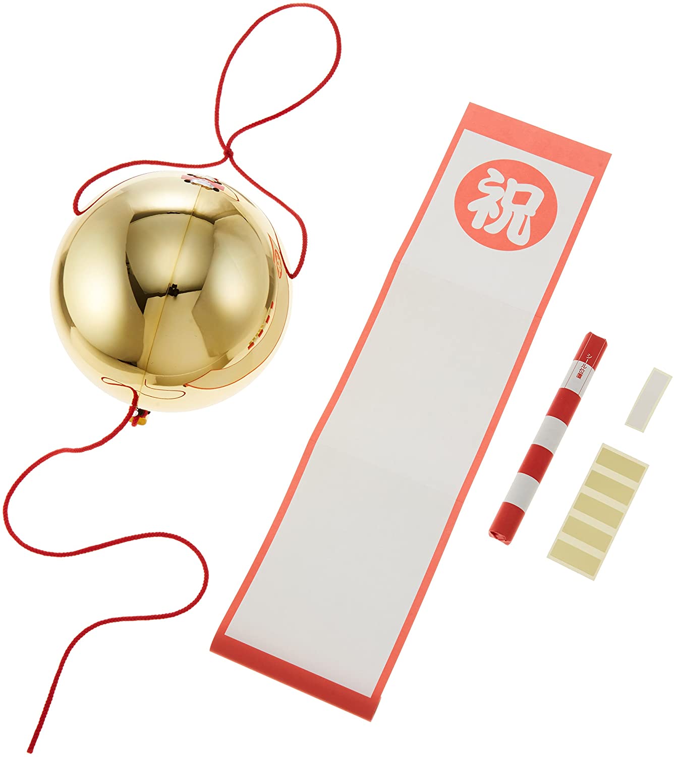 イベントで大活躍。パーティーの演出に。金のくすだま。紐を引くとキラキラテープと「祝おめでとう」垂れ幕が出てくる、お馴染みのお祝いアイテム。イベントやパーティーが一気に盛り上がる。テープや垂れ幕は本体についているため繰り返し使用でき、ゴミも出ない。無地垂れ幕も1枚ついているのでオリジナルメッセージを書いてお祝いできる[セット内容]無地垂れ幕1枚(.co.jpより)