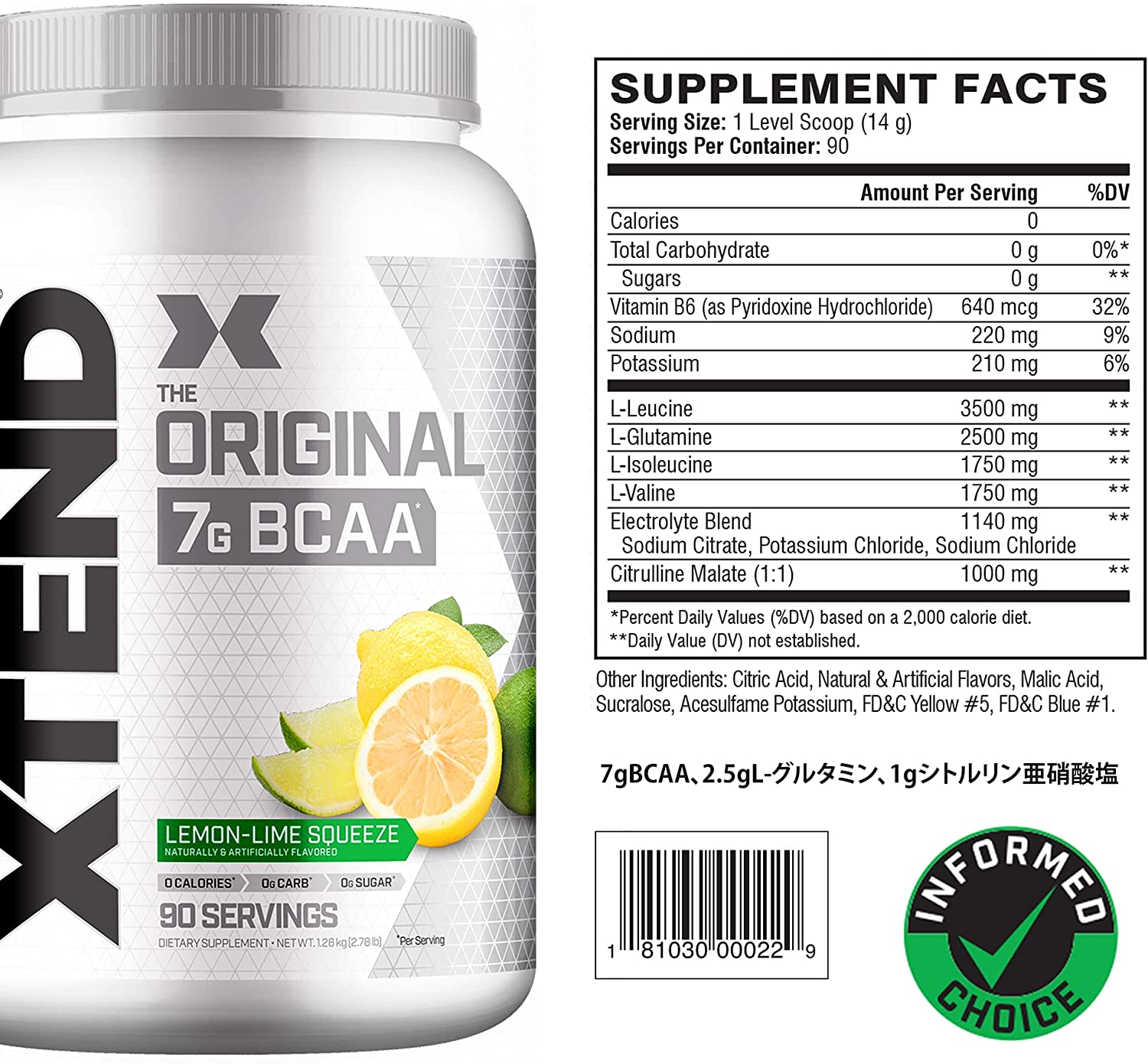 ・Scivation Xtend は、2:1:1の比率の分岐鎖アミノ酸(L-ロイシン、L-イソロイシン、L-バリン)を成分とするEnergy Amino、グルタミン、シトルリンマレート、およびビタミンB6の精密なスポーツブレンドです。