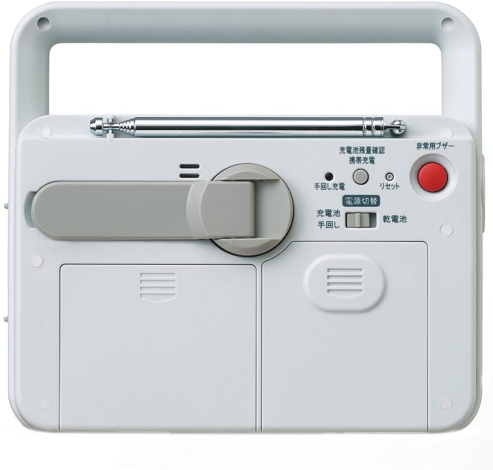 ・機能:手回し充電、AM/FMラジオ(モノラル)、懐中電灯ライト(LED)、非常用ブザー、音量調節(ラジオのみ)、ステップ秒針、電子音アラーム⇔ラジオの選択式、スヌーズ、アラームオートストップ約5分、文字板ライト、イヤホンジャック
