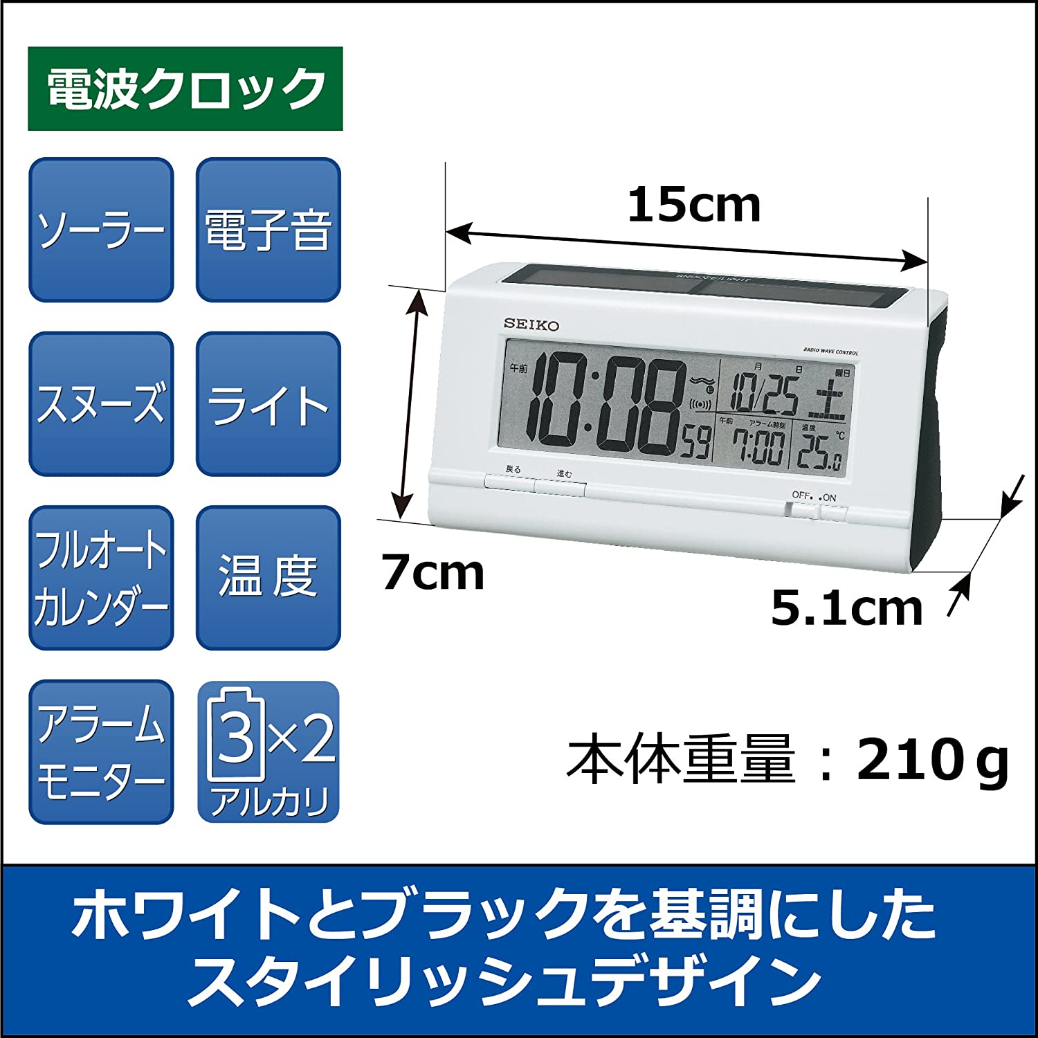 セイコー クロック 目覚まし時計 ハイブリッドソーラー 電波 デジタル カレンダー 温度 表示 白 パール SQ766W SEIKO