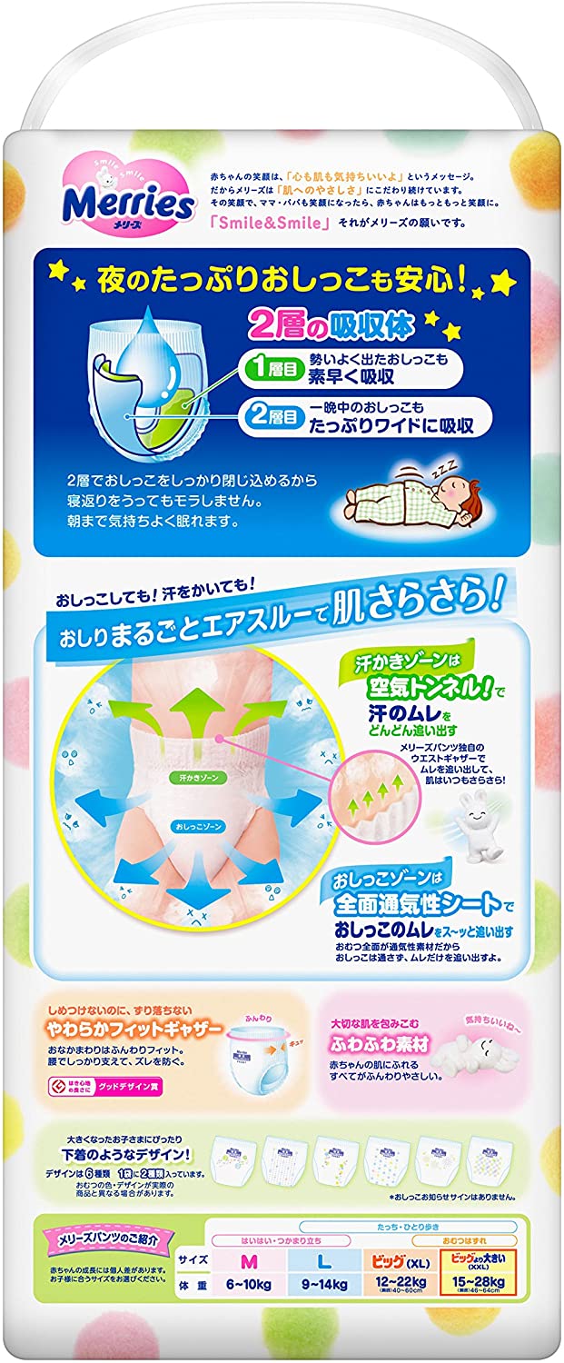 商品紹介おむつ内側に独自の凹凸シート「ふんわりエアリーメッシュ」を採用。シートと肌の間を空気が通ってムレを逃がす、肌にやさしい工夫です。さらにお腹まわりの「空気トンネル」からもおしっこや汗のムレを追い出すから、おしりまるごとエアスルーで肌さらさら。 ウエスト部分には、はき心地を考えた「やわらかフィットギャザー」。お腹まわりはしめつけず、腰で支えてズレを防ぎます。 ●「おしっこお知らせサイン」つき(2本線が青に変わったら取り替え時です)使用上の注意●こまめに交換し、肌に残ったうんちはきれいに拭き取ってください。 ●お肌に異常が出たら使用を中止し、医師にご相談ください。 ●お子様が紙おむつや外袋を口に入れないよう、手の届かない所に保管してください。 >誤って食べてしまった場合の応急処置 ●おしっこお知らせサインは、未使用でも湿度の高い条件で、部分的に色が変わることがありますが、ご使用には問題ありません。また、日光の影響で色が変わりにくくなることもあります。 ●変形・変色のおそれがありますので、暖房器具の近くなど高温になる所に置かないでください。 ●外袋の色が落ちることがありますので、洗剤などが付着しないようご注意ください ●誤って洗濯した時は、脱水後、衣類についたパルプやゼリー状の粒*をはたき落とし、洗濯機内部に残ったものは取り除いてください。 >おむつを洗濯してしまった時の処置 *ゼリー状の粒は、高分子吸収材が水分を吸収してふくらんだものです。メリーズに使用している高分子吸収材の安全性は十分に確認されています。[応急処置]口の中に残っているもの、のどに詰まっているものがあれば、すぐに取り出してください。窒息のおそれがあります。 詰まっているものが取り出せない場合は、すぐに医師の診察を受けてください。 すでに飲み込んでしまった場合は、消化されずにそのまま排泄されますので、特に処置の必要はありません。 多量に食べてしまった場合、具合が悪くなった場合は、すぐに製品を持参して医師に相談してください。商品に関するお問合せ・ご意見は「花王消費者相談室」0120-165-695 受付時間:9:00~17:00(土・日・祝日は除く)