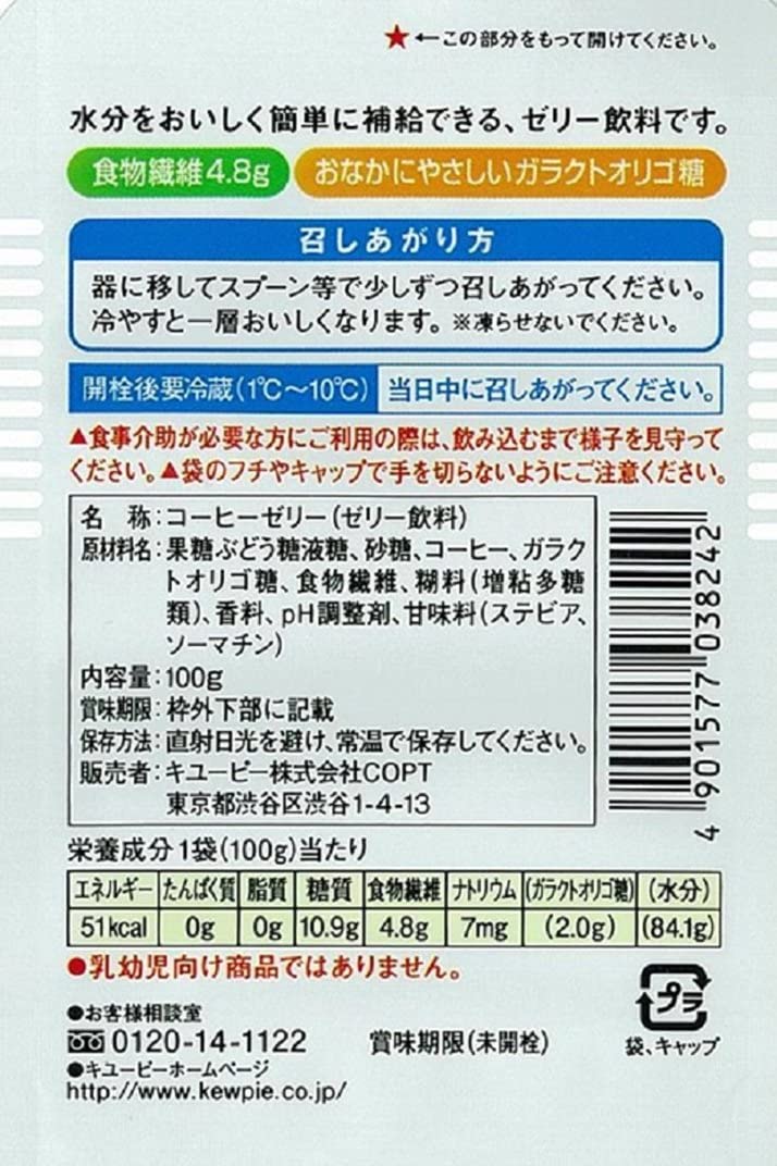 商品紹介開栓後当日中に召し上がってください。食事介助が必要な方にご利用の際は、飲み込むまで様子を見守ってください。袋のフチやキャップで手を切らないようにご注意ください。●水分をおいしく簡単に補給できる、果汁入りのゼリー飲料です。●区分4かまなくてよいゼリー飲料です。●お腹にやさしいがガラクトオリゴ糖を使用しています。●食物繊維を4配合。●乳幼児向け商品ではありません。●直射日光を避け、常温で保存してください。ご注意(免責)>必ずお読みください※当店にて、腎臓病食、介護食、栄養補助食品、低カロリー食品をお買い求めの際は、必ずかかりつけの医師や栄養士等の指導をお受けになってください。※当店では、商品の出荷で使用する梱包ダンボールを再利用して出荷しています。メーカー商品のダンボールを再利用しているため、ダンボールにご購入商品とは関係のない商品名が印刷されていることがありますが、内容物は注文商品をお送りしておりますのでご安心ください。ご理解とご協力の程、よろしくお願い申し上げます。