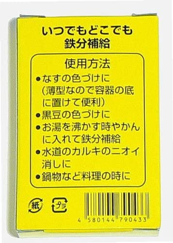 奥州市の特産物、南部鉄器で作ったヒット商品です。 不足しがちな鉄分を毎日手軽に補給できます。 お鍋に、やかんにポンっと入れるだけ。 薄型なのでお鍋ややかんの中で転がりません。 -ご注意- ◆使用する時はよく洗ってからご使用ください。 ◆お酢と一緒のご使用はご遠慮ください。 ◆使用後は取り出して下さい。容器のサビの原因になります。 -使用方法- ◆お湯(お茶・鍋物・味噌汁・ご飯)を沸かす時に ◆ナスの料理に使うと色あせず仕上がります ◆黒豆を煮る時に入れると、きれいな黒に仕上がります ◆アサリ・シジミなど貝類の砂出し用に ◆花びんに入れると花が長持ちします ◆お湯を沸かすときやかんに入れて鉄分補給 ◆水道のカルキのニオイ消しに ◆鍋物などの料理の時にの時に 鉄分は“食物”と“南部鉄器”から。 南部鉄器で調理すると鉄が溶けだすので、料理中の鉄量はステンレス製に比べて多くなります。 また、鉄瓶から溶け出す鉄の80%近くが人体に吸収されやすい形の鉄(2価の無機鉄)でした。 現代の食生活に不足しがちな鉄分は、南部鉄器の調理器具を使用することによって知らず知らずのうちに補給することができます。 鉄製の調理器具を日常的に活用することで鉄の補給を心掛けたいものです。 なお、南部鉄器の調理器具はガスコンロだけでなく電磁調理器にも使えるののが多くあります。
