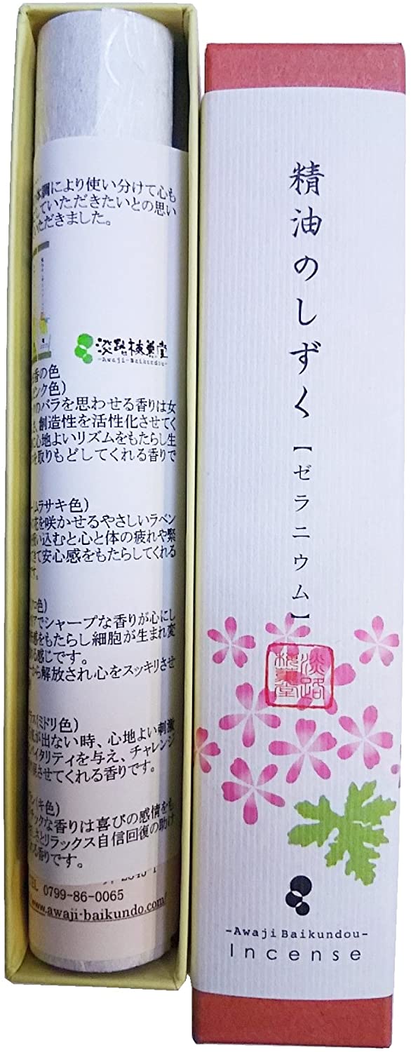 天然精油のしずく・・もうこれ以上はないという、エジプト産精油のゼラニウムを用いた液体香料の精油使用割合100%。  お線香製造の本場淡路島で手作りしている安心の日本製。                                                            アロマお香スティック。元気を与えてくれるような天然・自然のゼラニウム精油のスティックタイプのアロマお香です。 精油のお香。原材料:エジプト産ゼラニウム精油・インド産老山白檀・タブ粉  生産地:日本(お線香製造の本場淡路島) パッケージ:紙箱/パッケージサイズ:長さ14.7cm×高さ2.5cm×幅3cm  形状:上質アロマお線香。精油のアロマスティックお香。内容量:9g/重さ:約32g/長さ:約14cm/燃焼時間:約30分                                                            かわいいピンクのバラを思わせる香りは女性的なやさしさ、創造性を活性化させてくれます。   火をつける前の香りが好きな方や、火を使わずに活用したい場合には洗面所、鏡台、玄関にシャンパングラスなどにお香スティック数本立てておくだけでも良い香りがします。 ?  創業から百年以上の歴史を誇る淡路梅薫堂製造。長年の伝統製法を大切にお線香を作り続けております。                                                            心身に心地よいリズムをもたらし生活にバランスを取りもどしてくれる香りです。 ご進物用・ギフト・贈答用・癒しのお香は、大切な人へ想いを形に淡路梅薫堂のこだわりお香、精油のしずくの香りに託してどうぞ。