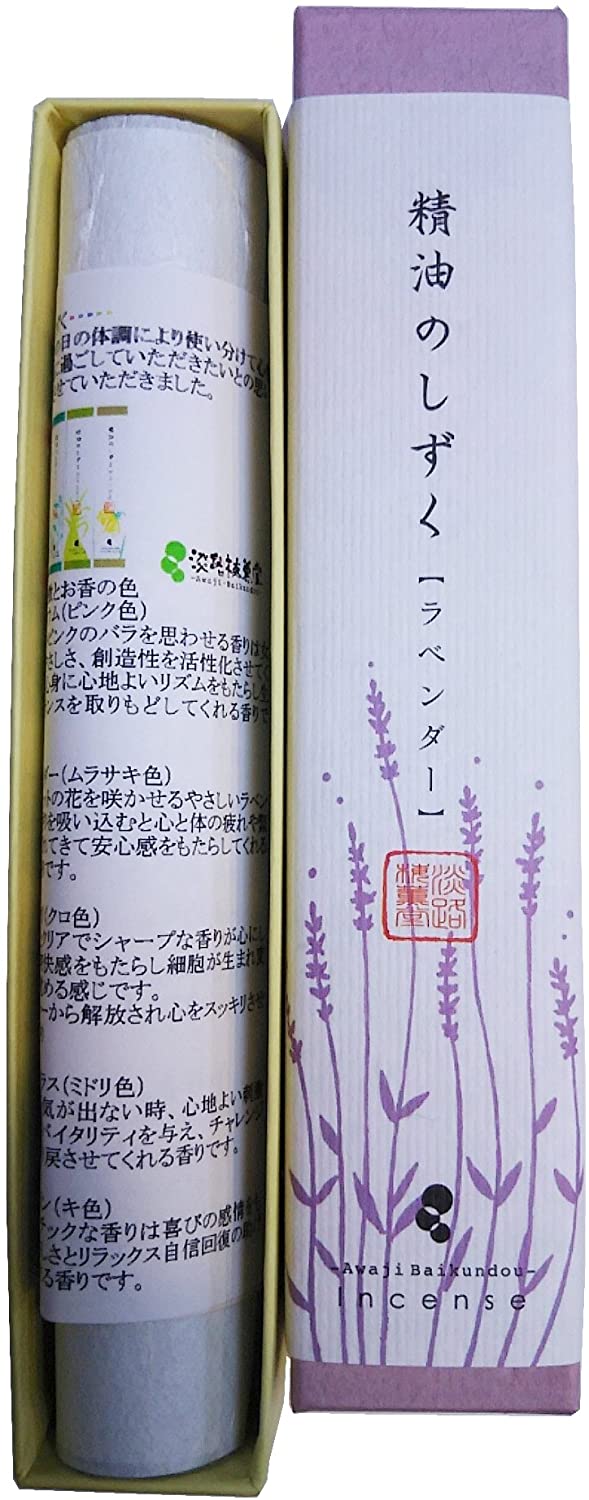 天然精油のしずく・・もうこれ以上はないという、フランス産精油のラベンダーを用いた液体香料の精油使用割合100%。  お線香製造の本場淡路島で手作りしている安心の日本製。                                                            アロマお香スティック。気持ちを楽にしてくれる天然・自然のアロマスティックタイプのラベンダーお香。 精油のお香。原材料:フランス産ラベンダー精油・インド産老山白檀・タブ粉  生産地:日本(お線香製造の本場淡路島) パッケージ:紙箱/パッケージサイズ:長さ14.7cm×高さ2.5cm×幅3cm  形状:上質アロマお線香。精油のアロマお香。内容量:9g/重さ:32g/長さ:約14cm/燃焼時間:約30分                                                            気持ちを楽にしてくれる天然・自然のアロマスティックタイプのラベンダーお香。精油のしずくラベンダーはお部屋に優しく広がります。  バイオレットの花を咲かせるやさしいラベンダーは香りを吸い込むと心と体の疲れや緊張がほぐれてきて安心感をもたらしてくれる癒しの香りです。  火をつける前の香りが好きな方や、火を使わずに活用したい場合には洗面所、鏡台、玄関にシャンパングラスなどにお香スティック数本立てておくだけでも良い香りがします。   創業から百年以上の歴史を誇る淡路梅薫堂製造。長年の伝統製法を大切にお線香を作り続けております。                                                            精油のしずくラベンダーはお部屋に優しく広がります。 ご進物用・ギフト・贈答用・癒しのお香は、大切な人へ想いを形に淡路梅薫堂のこだわりお香、精油のしずくの香りに託してどうぞ。