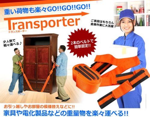 お引っ越しやお部屋の模様替えなどに!!家具や電化製品などの重量物を楽々運べる!!大型家電や重たい荷物が引越しや模様替えでも大活躍!!今まで大人数で運んでいたものや業者に頼んでいたものも、このトランスポーターがあれば2人で楽々運搬できます。少人数で軽々運べる♪簡単取り付けでしっかり固定荷物のしたにクロスさせる事により安定感UP!!手ではなく腕に負担をかける事で重さを分散させて、楽々運ぶ事が可能になりました長さも自由に調節可能このトランスポーターは輪の部分が3箇所あり、運ぶものの大きさによって腕を通す輪を変えながら、長さを調節する事ができます。長さ:2.72メートル幅:4.5cm2本入り