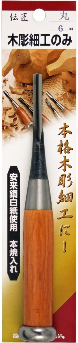・本格木彫細工に! ・曲面の荒削り作業に。 ・桂付きで叩いて作業できます。 ・通常のノミより柄が短く、刃先までの距離も近いので細かな作業に適しています。 ・材質 刃部:安来鋼白紙二号、柄部:赤樫 【商品詳細】 サイズ:6mm