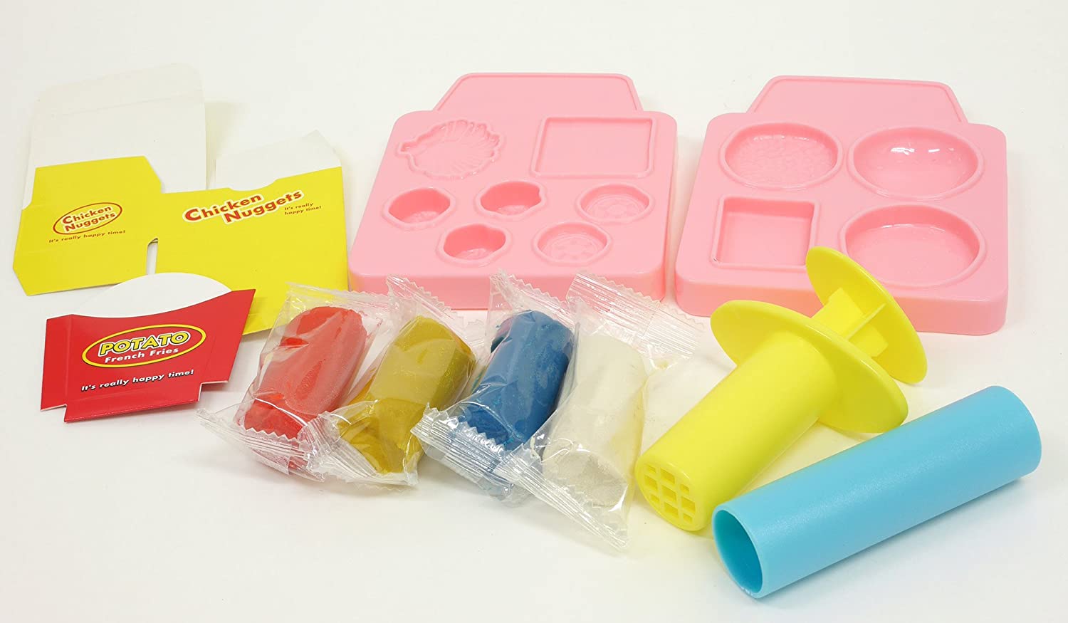 ・セット内容:こむぎねんど4色(白、青、赤、黄)、ねんど型2個、チキンナゲット箱、ねんどローラー、ポテト押し出し器、保存袋、フライドポテト箱