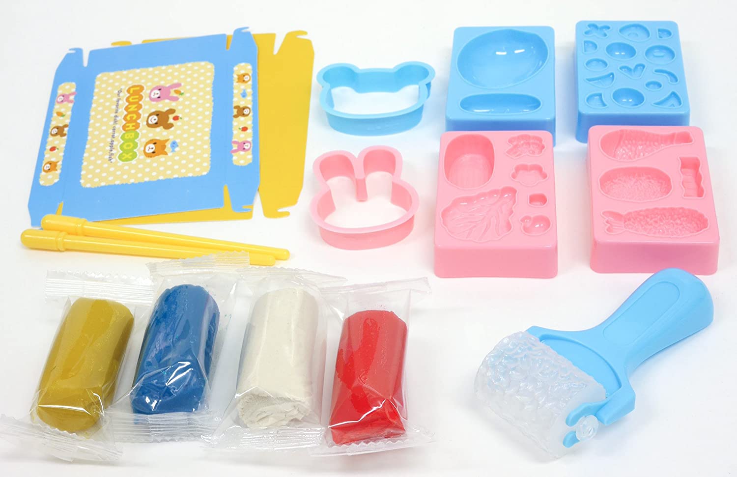 ・セット内容:こむぎねんど4色(白、青、赤、黄)、ねんど型4個、どうぶつ型2個、ご飯型ローラー、はし、おべんとう箱、保存袋