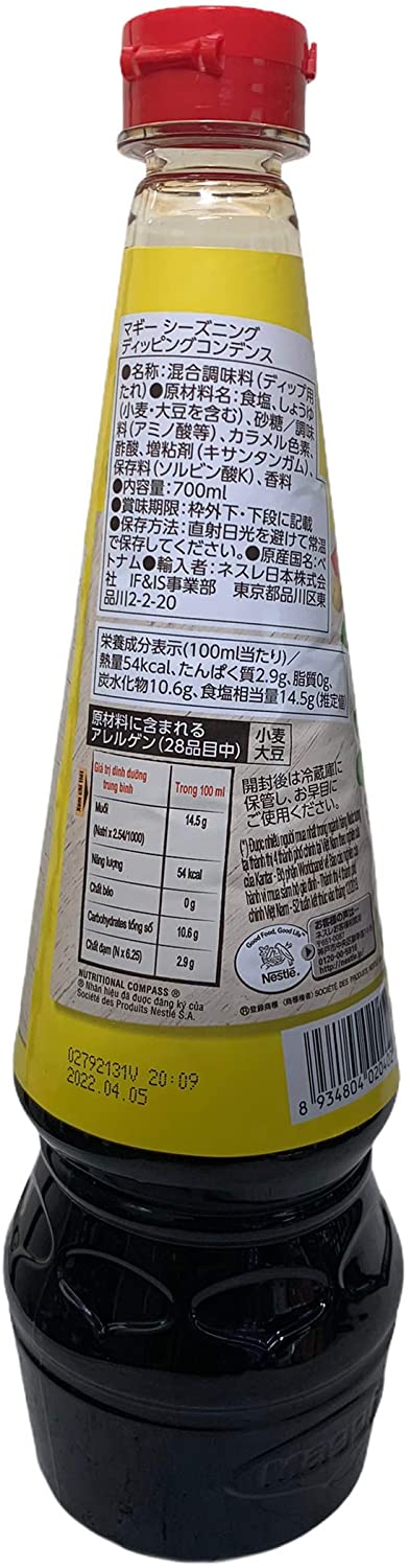 名称:混合調味料(ディップ用たれ) 原材料名:食塩、しょうゆ(小麦・大豆を含む)、砂糖/調味料(アミノ酸等)、カラメル色素、酢酸、増粘剤(キサンタンガム)、保存料(ソルビン酸K)、香料 内容量:700ml 賞味期限:枠外下・下段に記載 保存方法:直射日光を避けて常温で保存してください。 原産国:ベトナム 開封後は冷蔵庫で保管し、お早めにご使用ください。備考:商品のデザインは予告なく変更される可能性があります。ご了承下さい。