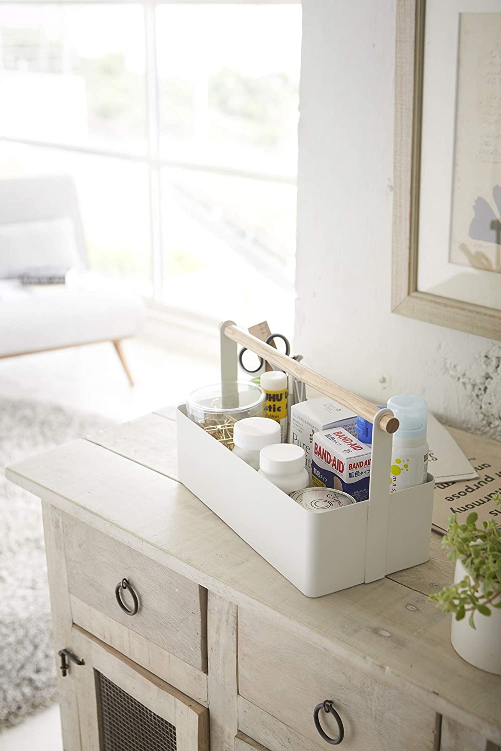 ・※販売元、発送元が日本国外の場合、コピー品の恐れがありますのでご注意ください ・サイズ:約W29×D13×H16cm ・本体重量:約720g ・素材:本体/スチール(粉体塗装)、バー/天然木、ストッパー/シリコン樹脂 ・生産国:中国 【商品詳細】 パターン(種類):L商品紹介『YAMAZAKI』のロゴで知られている山崎実業は大正初期の創業の歴史あるインテリア雑貨の専門メーカーです。そんな山崎実業が手がけるブランド"tosca(トスカ)"スチールのシンプルなデザインに木をプラスすることで、北欧風のぬくもりのある美しいキッチンに。自宅にいながらカフェにいるような雰囲気を味わえます。洗練されたデザインと機能性が、すっきりと綺麗に整理された、使い易いキッチンへ整えられます。持ち運びがしやすいコンパクトなボックス! 救急箱・裁縫道具・ベビー用品・玄関先の小物入れに最適。使いたいときにすぐに使えて持ち運びも便利。サイズ:本体/W29×D13×H16(cm)品質表示:本体/スチール(粉体塗装)バー/天然木、ストッパー:シリコン樹脂より●サプリメントや絆創膏等の救急道具や、散らかりがちなリビングの細々したモノを収納するのに便利なツールボックス