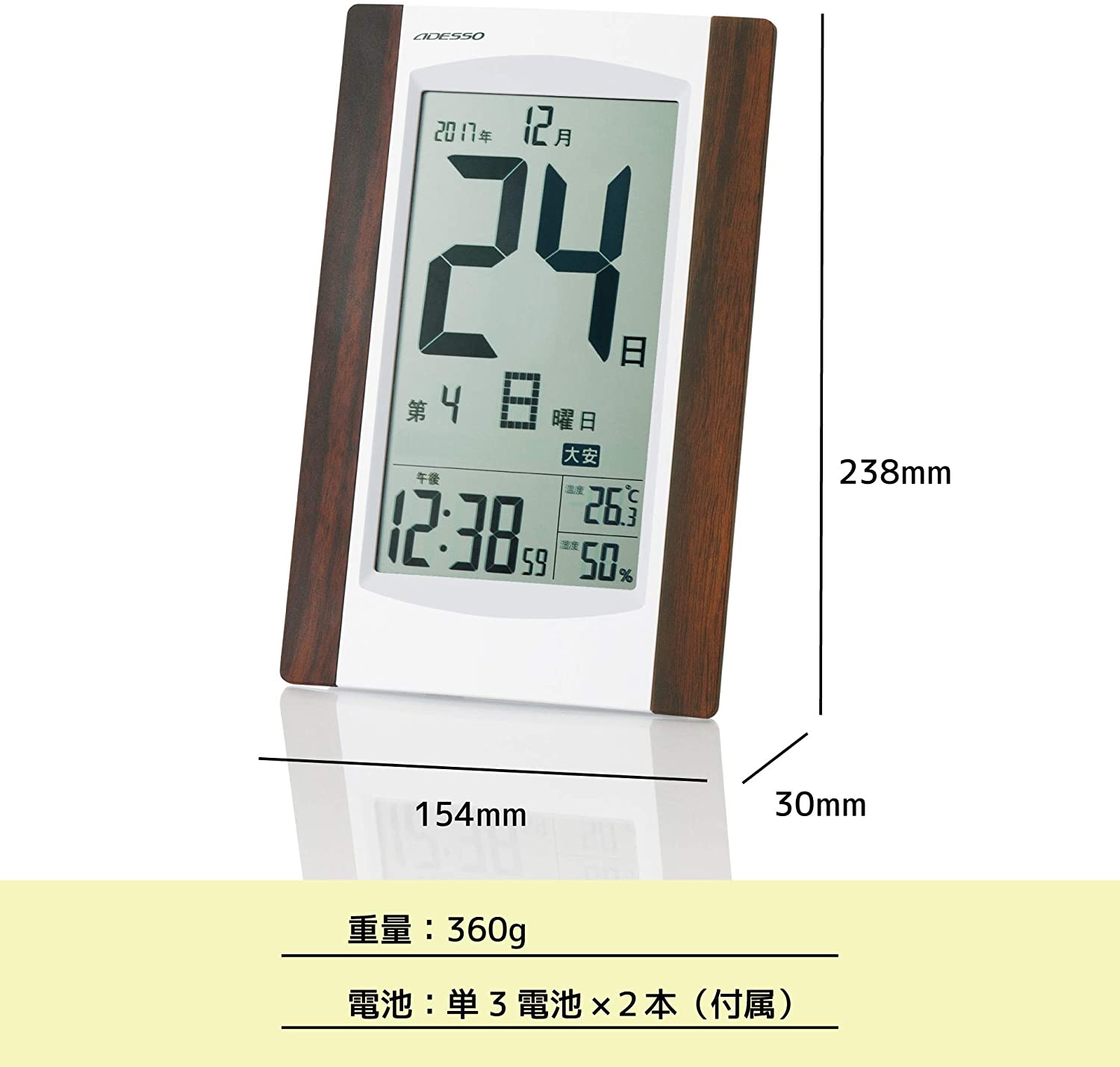 メーカー説明 “MORE THAN A CLOCK” 時計に新しい存在意義を 時間だけならスマホを見ればわかる。そんな中、アデッソは”時”というものを捉えなおし、 より良い体験を提供できる時計の再開発に取り組んでいきます。 人、場所、タイミング それぞれにぴったりな時計を生み出す 起きること、寝ること、スケジュール管理など、時間というものは私たちの生活と切り離すことができません。 アデッソはそれぞれの暮らしに寄り添いながら、生活がより便利で楽しくなる時計づくりを心がけています。 デザインから品質管理まで アデッソは1993年に東京都大田区で創業。 すべての商品は自社で企画、開発を国内で行い、信頼できる中国工場で生産します。品質管理の徹底ため、山形県の自社検品場で全数厳格な基準を設けて検品します。 もっと読む デジタル日めくり電波時計 メーカーより 紙の日めくりカレンダーをモデルにした「めくらなくていい」日付表示の大きなクロック。ご高齢の方や初期の認知症の方を介護しているご家族からご好評の声をいただいているシリーズです。曜日の感覚がなくなりがちなご高齢の方に、自立して行動していただくことがご家族の負担を減らすことにつながります。 めくらなくていい日めくり デジタル日めくりは紙の日めくりと違い , 毎日めくる必要がありません。なのでまちがえてめくってしまう心配がありません。 今日は何日、何曜日? ご高齢の方、初期の認知症の方は毎日の、日付・曜日感覚がなくなりがちで、 家族の方に確認しなければいけないこともあるようです。 「今」がいつか、もう迷わない。 デジタル日めくりは大きな日付表示で、どなたにでもハッキリ表示を確認 することができます。もう今日が何日、 何曜日かもう迷うことはありません。 デジタル日めくりのパイオニア アデッソは2008年記念すべきHIMEKURIシリ ーズ初のモデルを発売以来、どなたにでも見 やすい、わかりやすい表示のサイズ、レイアウ トを研究して参りました。これからも高齢者の 方や初期の認知症患者の方が自立した生活 を送れるよう、商品を通してサポートしていきます。 もっと読む KW9254T-8656NA-101HM-301HM-501HM-602温度・湿度表示〇〇〇×××日付表示の縦70mm70mm47mm51mm19mm35mm曜日表示の縦20mm20mm15mm65mm97mm11mm第何曜日表示〇〇〇〇〇×六曜表示〇〇〇×××