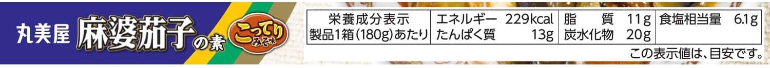 商品紹介point1.丸美屋特製の麻婆ソースで野菜やお肉が手軽においしく食べられます。point2.フライパン1つでできる簡単調理、手間をかけずにサッと作れます。pont3.3~4人前なので、家族みんなで楽しめるメニューです。甘味のある甜麺醤(テンメンジャン)に、XO醤をプラスし、より深い味わいと濃厚なコクを出しました。濃厚ななかにもまろやかさのあるこってりみそ味です。原材料・成分鶏肉、みそ、砂糖、豆板醤、甜麺醤、にんにくペースト、たん白加水分解物、大豆油、豆?醤、ポークエキス、食塩、辣醤、香辛料/増粘剤(加工でん粉、キサンタン)、調味料(アミノ酸)、着色料(カラメル、カロチノイド)、酸味料、甘味料(ステビア)、(一部に小麦・大