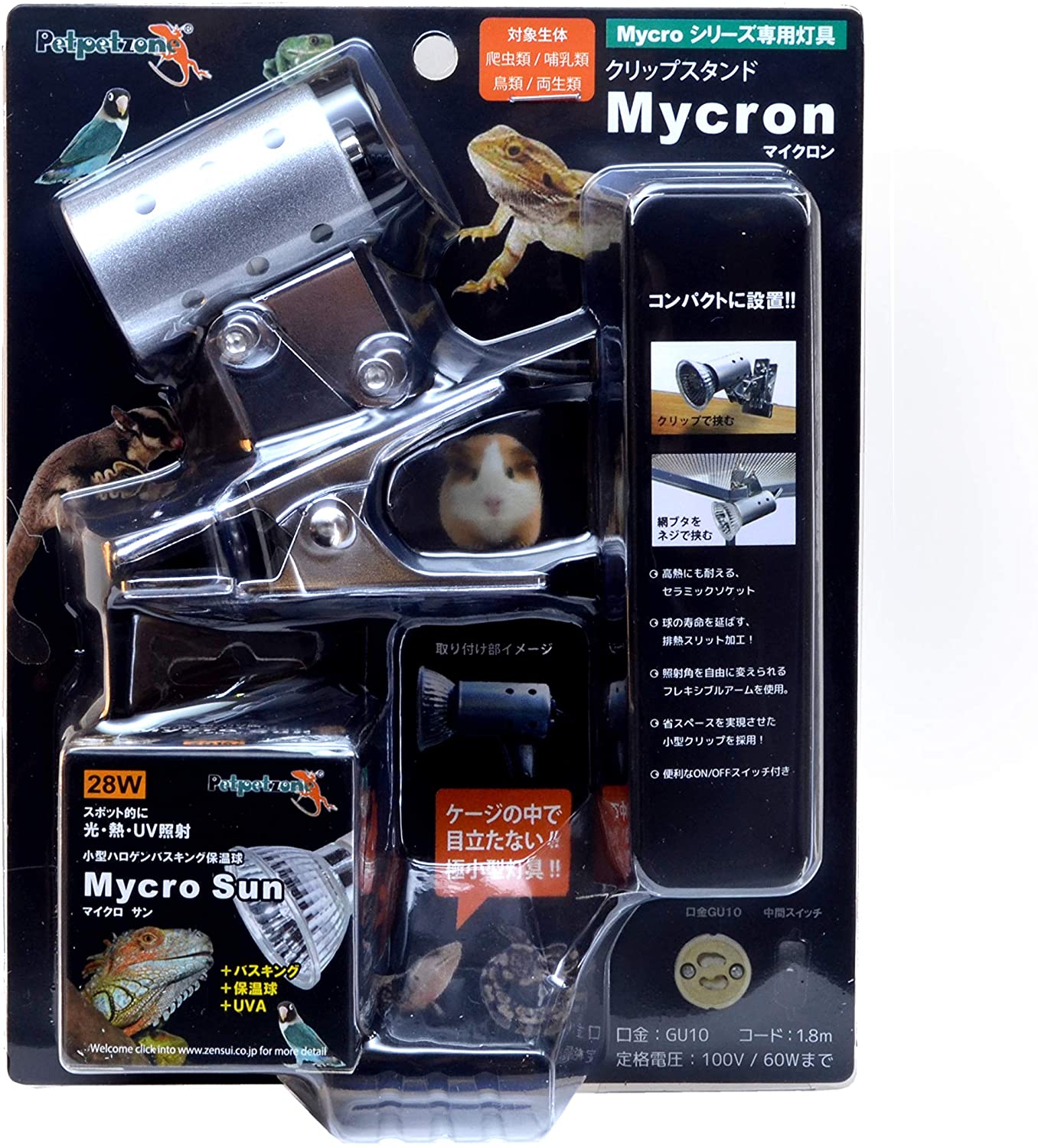 保温と紫外線照射が1つになった超小型ハロゲンランプと専用灯具「マイクロン」がセットになった、小型ケージに最適な爬虫類・両生類飼育用照明器具です。 ※本製品は口金サイズがGU10となっており、一般的な爬虫類保温球で用いられるE26口金サイズの電球は適合しません。付属の電球が使用寿命等で使用できなくなった場合は必ず専用の『マイクロサン』28Wまたは53Wをお求めください。