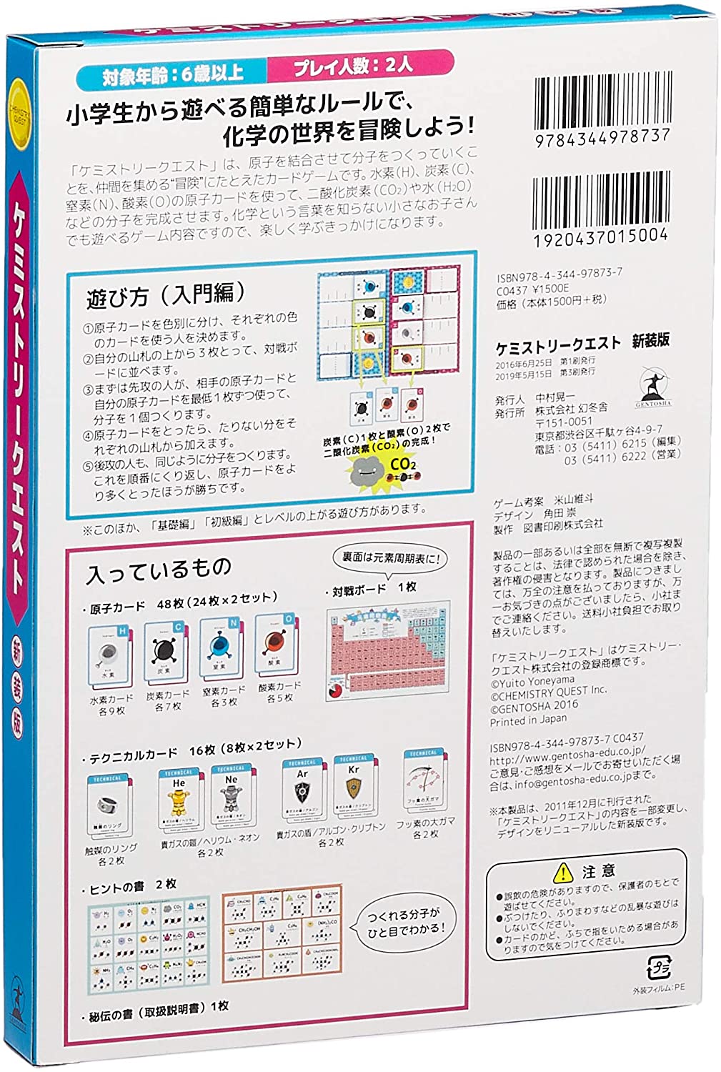 「ケミストリークエスト」は原子を結合させて分子をつくっていくことを、仲間を集める“冒険"にたとえたカードゲームです。水素(H)、炭素(C)、窒素(N)、酸素(O)の原子カードを使って、二酸化炭素(CO2)や水(H2O)などの分子を完成させます。化学という言葉をを知らない小さなお子様でも遊べるゲーム内容ですので、楽しく学ぶきっかけになります。(.co.jpより)