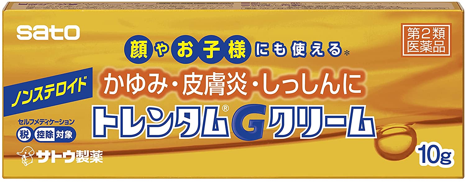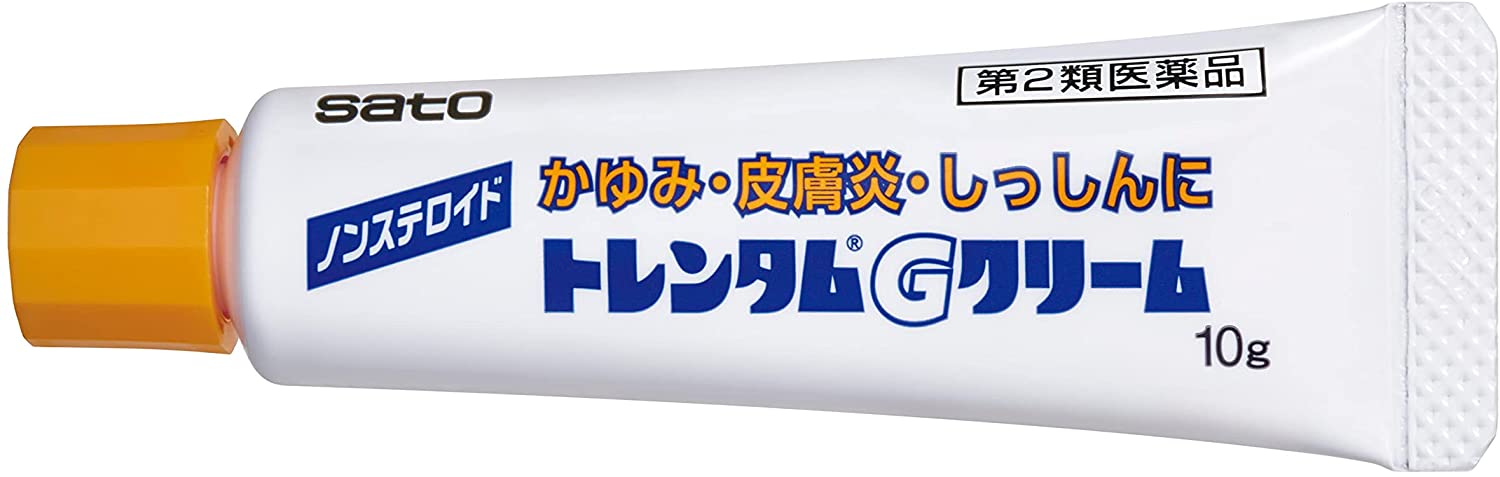 ・内容量:10g ・ ・ ・ ・ 【商品詳細】 サイズ:10グラム (x 1)?|?セット数:1商品紹介非ステロイド性鎮痒消炎薬トレンタムGクリームは・・・●抗炎症成分ウフェナマート、グリチルリチン酸二カリウムに、かゆみを抑えるリドカイン、クロルフェニラミンマレイン酸塩、皮膚の血行を促すトコフェロール酢酸エステルを配合した鎮痒消炎薬で、かゆみ、皮膚炎、しっしんなどにすぐれた効果を発揮します。●べとつかず、のびがよく、塗った後も目立たない使いやすいクリームです。医薬品は、用法用量を逸脱すると重大な健康被害につながります。必ず使用する際に商品の説明書をよく読み、用法用量を守ってご使用ください。用法用量を守って正しく使用しても、副作用が出ることがあります。異常を感じたら直ちに使用を中止し、医師又は薬剤師に相談してください。医薬品の販売について●使用上の注意■■してはいけないこと■■■■相談すること■■1.次の人は使用前に医師、薬剤師又は登録販売者にご相談ください (1)医師の治療を受けている人。 (2)薬などによりアレルギー症状を起こしたことがある人。 (3)湿潤やただれのひどい人。2.使用後、次の症状があらわれた場合は副作用の可能性がありますので、直ちに使 用を中止し、この文書を持って医師、薬剤師又は登録販売者にご相談ください 関係部位・・・症状 皮膚・・・発疹・発赤、かゆみ、はれ、刺激感(ヒリヒリ感)、熱感、乾燥感3.5~6日間使用しても症状がよくならない場合、また症状の悪化がみられた場合は 使用を中止し、この文書を持って医師、薬剤師又は登録販売者にご相談ください●効能・効果皮膚炎、かぶれ、湿疹、かゆみ、おむつかぶれ、ただれ、あせも●用法・用量1日数回、適量を患部に塗布します。(1)定められた用法・用量を厳守してください。(2)小児に使用させる場合には、保護者の指導監督のもとに使用させてください。(3)目に入らないように注意してください。 万一、目に入った場合には、すぐに水又はぬるま湯で洗ってください。 なお、症状が重い場合には、眼科医の診療を受けてください。(4)外用にのみ使用してください。(5)患部を清潔にしてから、使用してください。●成分・分量1g中成分・・・分量・・・働きウフェナマート・・・50mg・・・非ステロイド性抗炎症成分で、炎症部位に直接作用し、患部の炎症や痛みを抑えます。リドカイン・・・10mg・・・局所麻酔作用により、皮膚炎、かぶれなどに伴う不快なかゆみや痛みを抑えます。クロルフェニラミンマレイン酸塩・・・10mg・・・抗ヒスタミン作用により、患部の炎症を緩和し、かゆみを抑えます。トコフェロール酢酸エステル(ビタミンE酢酸エステル)・・・5mg・・・皮膚の血行を促すことにより、皮膚の新陳代謝をよくします。グリチルリチン酸二カリウム・・・5mg・・・皮膚炎、あせも、しっしんなどの炎症を鎮めます。添加物として、流動パラフィン、グリセリン、ステアリン酸、ステアリルアルコール、ステアリン酸グリセリン、ステアリン酸マクロゴール、パラベンを含有します。●保管及び取扱いの注意(1)直射日光の当たらない湿気の少ない涼しい所に密栓して保管してください。(2)小児の手の届かない所に保管してください。(3)他の容器に入れ替えないでください。 (誤用の原因になったり品質が変わるおそれがあります。)(4)使用期限をすぎた製品は、使用しないでください。(5)初めて使う方は試し塗りをおこなってください。●お問い合わせ先本製品についてのお問い合わせは、お買い求めのお店又は下記にお願い申し上げます。佐藤製薬株式会社 お客様相談窓口東京都港区元赤坂1丁目5番27号03-5412-73939:00~17:00(土、日、祝日を除く)使用上の注意副作用救済制度についての詳細は、PMDAにご相談ください。 フリーダイヤル0120-149-931 電話番号をよくお確かめのうえ、おかけください。 受付時間:午前9:00~午後5:00 / 月~金(祝日・年末年始を除く) Eメール:kyufu@pmda.go.jpご注意(免責)>必ずお読みくださいご使用の際は、お薬の説明書をよくお読みのうえご使用下さい。購入後のお問い合わせの際は、購入した店舗へお問い合わせ下さい。続きを見る