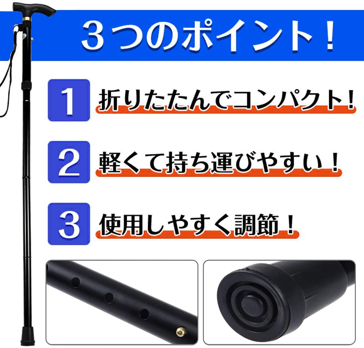 ・【便利な折り畳み式】折り畳んだ杖を一つにまとめられるストラップ付。使わない時はカンタンに折り畳み、コンパクト収納でお悩みを解消します。旅行やお出掛けにとても便利です。
