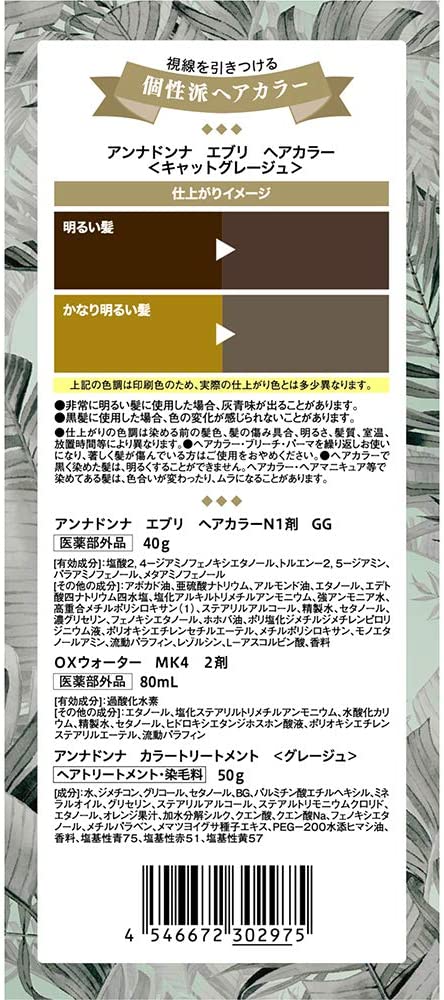 商品紹介個性的な髪色を楽しめるヘアカラー。色落ちが気になり始めた髪にカラーをプラスするカラートリートメント付きで、染めた髪色をより長く楽しめます。使用上の注意●ヘアカラーでかぶれたことのある方は絶対に使用しないでください。●ヘアカラーはアレルギー反応をおこすことがあります。●皮膚アレルギー試験(パッチテスト)を毎回必ずおこなってください。●ご使用の際は使用説明書をよく読んで正しくお使いください。●次の方は使用しないでください。・今までに本品に限らずヘアカラーでかぶれたことのある方・今までに染毛中または直後に気分の悪くなったことのある方・皮膚アレルギー試験(パッチテスト)の結果、皮膚に異常を感じた方・頭皮あるいは皮膚が過敏な状態になっている方(病中、病後の回復期、生理時、妊娠中等)・頭、顔、首筋にはれもの、傷、皮膚病がある方・腎臓病、血液疾患等の既往症がある方・体調不良の症状が持続する方(微熱、倦怠感、動悸、息切れ、紫斑、出血しやすい、月経等の出血が止まりにくい等)●薬剤や洗髪時の洗い液が目に入らないようにしてくださ●眉毛、まつ毛には使用しないでください。●幼小児の手の届かないところに保管してください。●高温や直射日光を避けて保管してください。○黒髪に使用した場合、色の変化が感じられないことがあります。○仕上がりの色調は染める前の髪色、髪の傷み具合、明るさ、髪質、室温、放置時間等により異なります。○ヘアカラー・ブリーチ・パーマを繰り返しお使いになり、著しく髪が傷んでいる方はご使用をおやめください。○ヘアカラーで黒く染めた髪は、明るくすることができません。ヘアカラー・ヘアマニキュア等で染めてある髪は、色合いが変わったり、ムラになることがあります。●髪の長い方、髪の量が多い方は2箱ご準備ください。●分けて使うことはできません。(使いきりタイプ)原材料・成分<1剤>[有効成分]:塩酸2,4-ジアミノフェノキシエタノール、トルエン-2,5-ジアミン、パラアミノフェノール、メタアミノフェノール[その他の成分]:アボカド油、亜硫酸ナトリウム、アルモンド油、エタノール、エデト酸四ナトリウム四水塩、塩化アルキルトリメチルアンモニウム、強アンモニア水、高重合メチルポリシロキサン(1)、ステアリルアルコール、精製水、セタノール、濃グリセリン、フェノキシエタノール、ホホバ油、ポリ塩化ジメチルジメチレンピロリジニウム液、ポリオキシエチレンセチルエーテル、メチルポリシロキサン、モノエタノールアミン、流動パラフィン、レゾルシン、L-アスコルビン酸、香料 <2剤>[有効成分]:過酸化水素[その他の成分]:エタノール、塩化ステアリルトリメチルアンモニウム、水酸化カリウム、精製水、セタノール、ヒドロキシエタンジホスホン酸液、ポリオキシエチレンステアリルエーテル、流動パラフィン水、ジメチコン、グリコール、セタノール、BG、パルミチン酸エチルヘキシル、ミネラルオイル、グリセリン、ステアリルアルコール、ステアルトリモニウムクロリド、エタノール、オレンジ果汁、加水分解シルク、クエン酸、クエン酸Na、フェノキシエタノール、メチルパラベン、メマツヨイグサ種子エキス、PEG-200水添ヒマシ油、香料、塩基性青75、塩基性赤51、塩基性黄57使用方法12剤に1剤を全量加え黒キャップをしめ、上下によく振って混ぜ合わせます。2ブラシ型ノズルに付け替え、乾いた髪全体にムラなく塗ります。3充分になじませた後、20分ほど放置し、よくすすぎ、シャンプー・コンディショナーで仕上げます。●混合乳液・すすぎ湯が目に入らないように特に注意してください。ヘアカラーが色落ちし始めたら付属のカラートリートメントのご使用をおすすめします。続きを見る